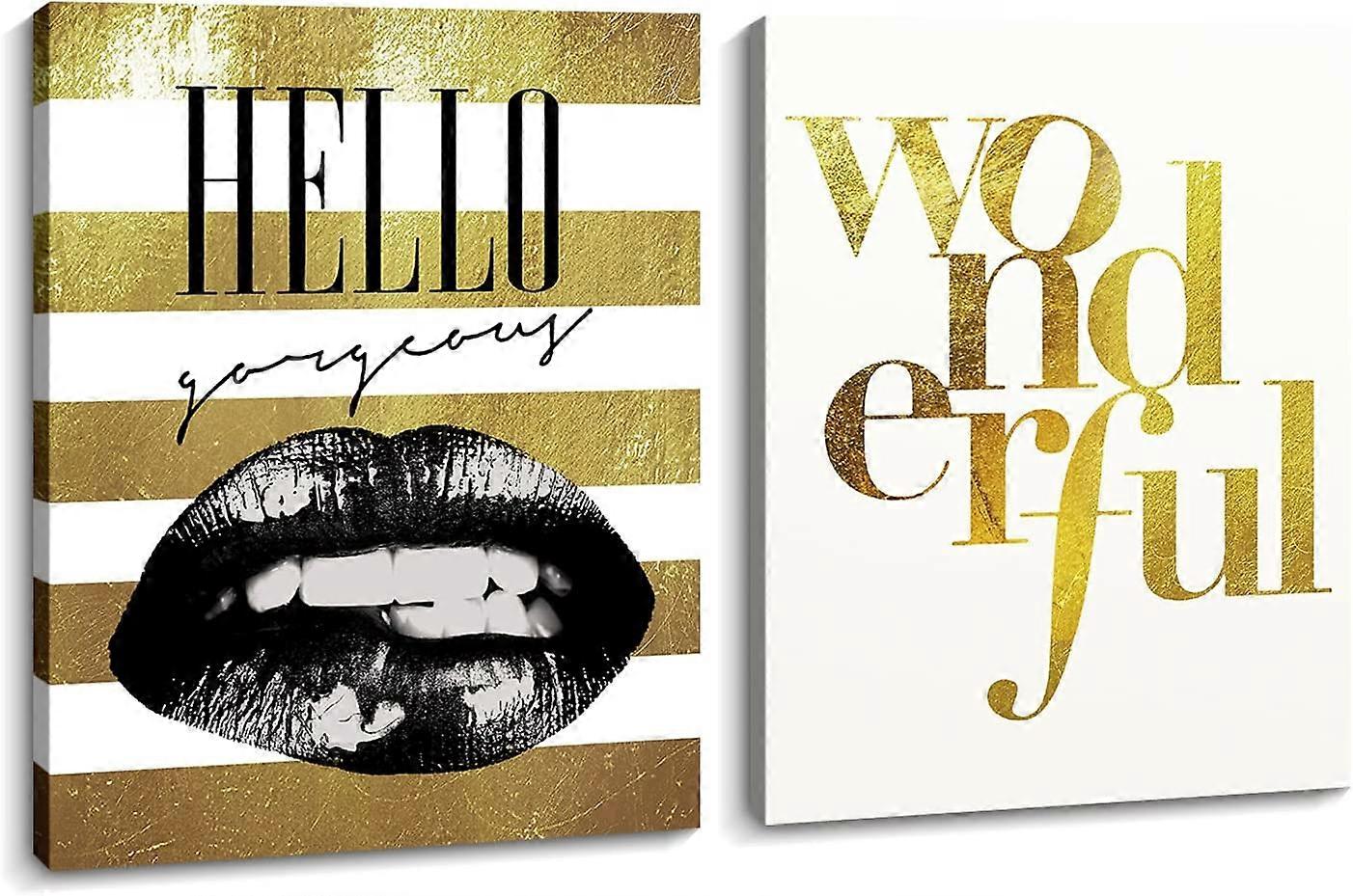 Fashion Women Wall Art 2 Pieces Lips Picture Canva Print Artwork Framed Set Black Gold Wall Decor for Girls Bedroom (Multi)