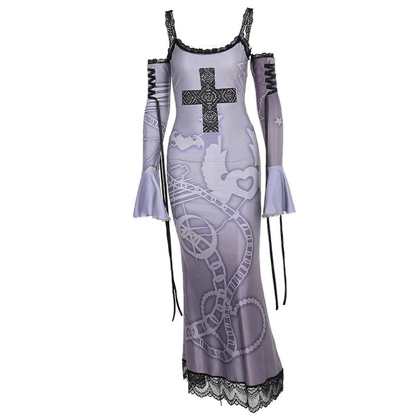 Fashion Women Dress Long Sleeve Bodycon Printed Patchworked Gothic Style Lady Suspender Dress for Spring 2024 S