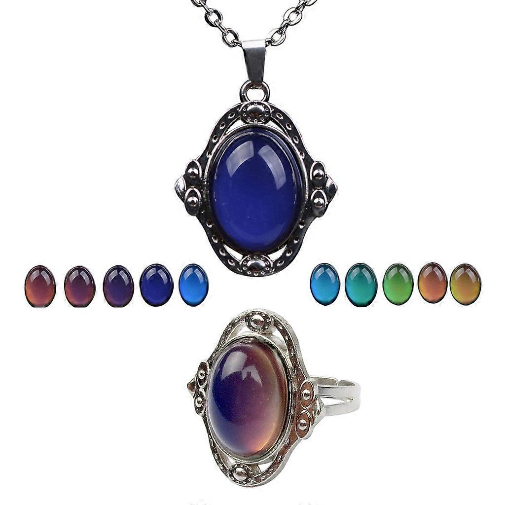 Fashion 1 Set Necklace+Ring All-match Retro Antique Gemstone Color Change Adjustable Open Ring + Necklace for Girls Boys