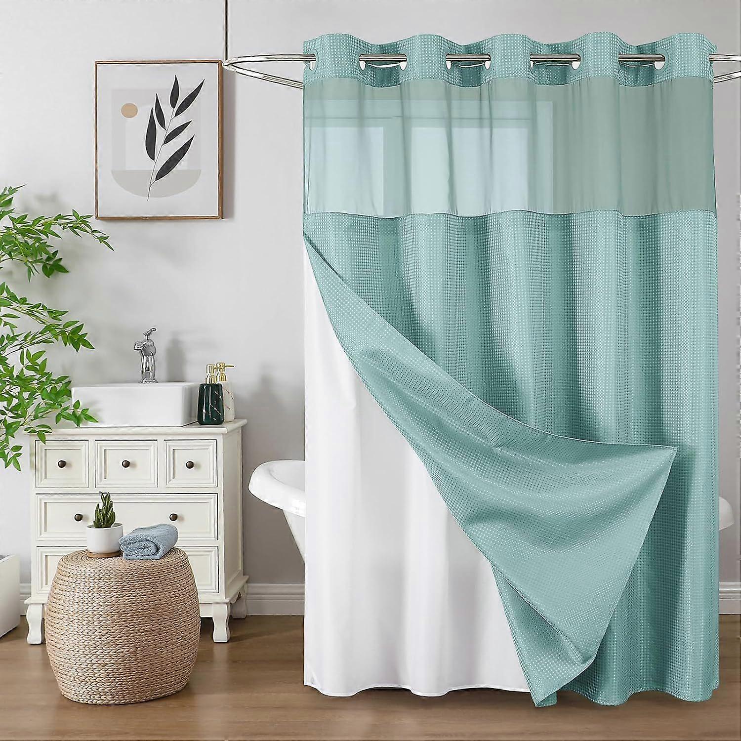 EASY CARE: Machine washable if needed, but please machine wash in cold water on gentle cycle. Use only nonchlorine bleach when needed and tumble dry on low heat. Iron on low heat as needed. NOTE: Separate curtains and snap liner before washing. PREMIUM QUALITY: Our shower curtains are made of carefully selected highquality polyester fabric that is skinfriendly and wrinklefree. 130gsm high weight fabric ensures the shower curtain has a great drape. The waffle weave pattern can match any bathroom style, adding an elegant atmosphere to your bathroom. WATER REPELLENT & WATERPROOF: We use water repellent waffle fabric and doublesided waterproof liner, allowing water droplets to roll off quickly without penetrating and soaking the waffle block fabric, keeping the bathroom dry. HANG IN SECONDS: No need to remove the shower curtain rod or buy extra hooks. We use no hook design to make it easier to hang and slide more smoothly, giving you worryfree installation. SHEER VIEWING WINDOW: The mesh window on the upper part of the shower curtain allows light in and air to circulate. It protects privacy while ensuring sufficient light in the bathroom.