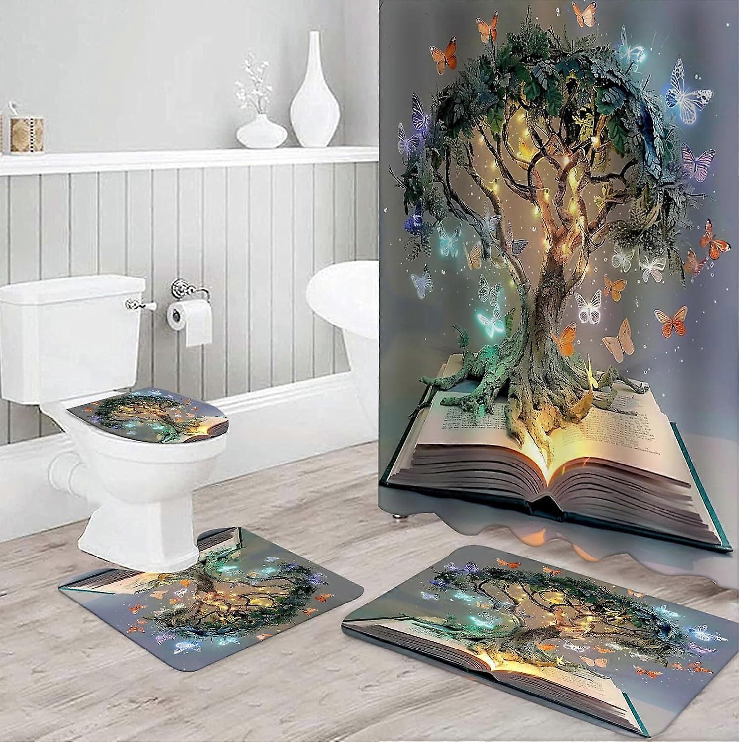 Fantasy Tree Shower Curtain & Rugs Set, 4pcs Waterproof Bath Decor with Toilet Seat Cover, Grey