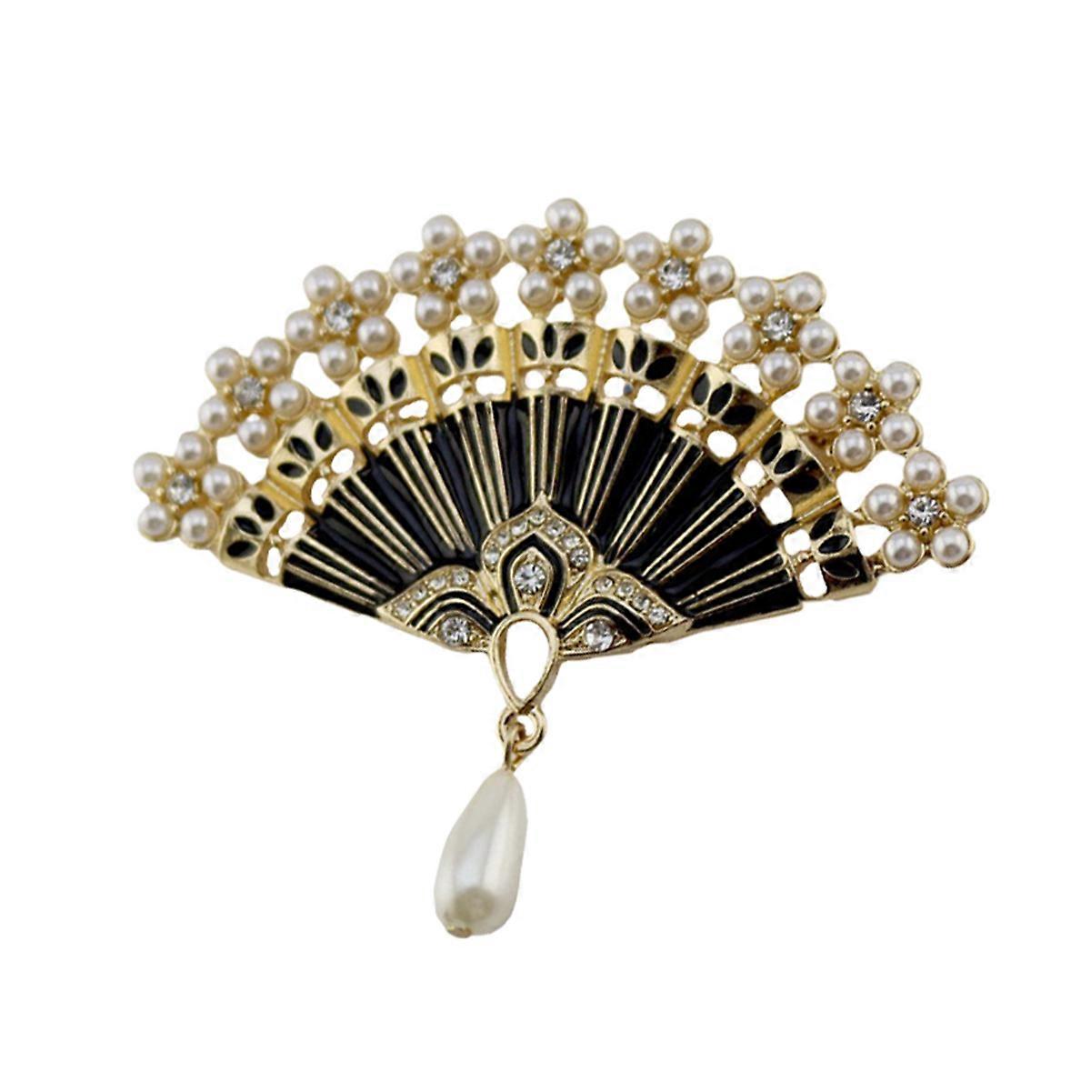 Fan Brooch Pin Vintage Chinese Style Rhinestone Inlaid Pearl Dress Accessories for Women Black 6.2*6.1cm 1Pcs