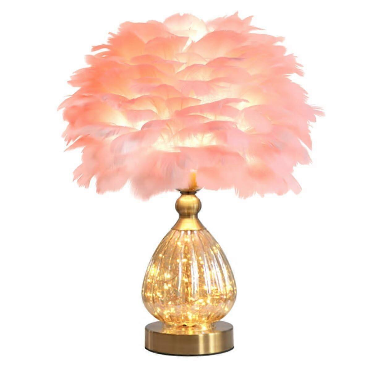 Crystal Feather Table Lamp with Fairy Lights, Pink Feather Lampshade, Luxury Bedside Lighting for Living Room and Bedroom
