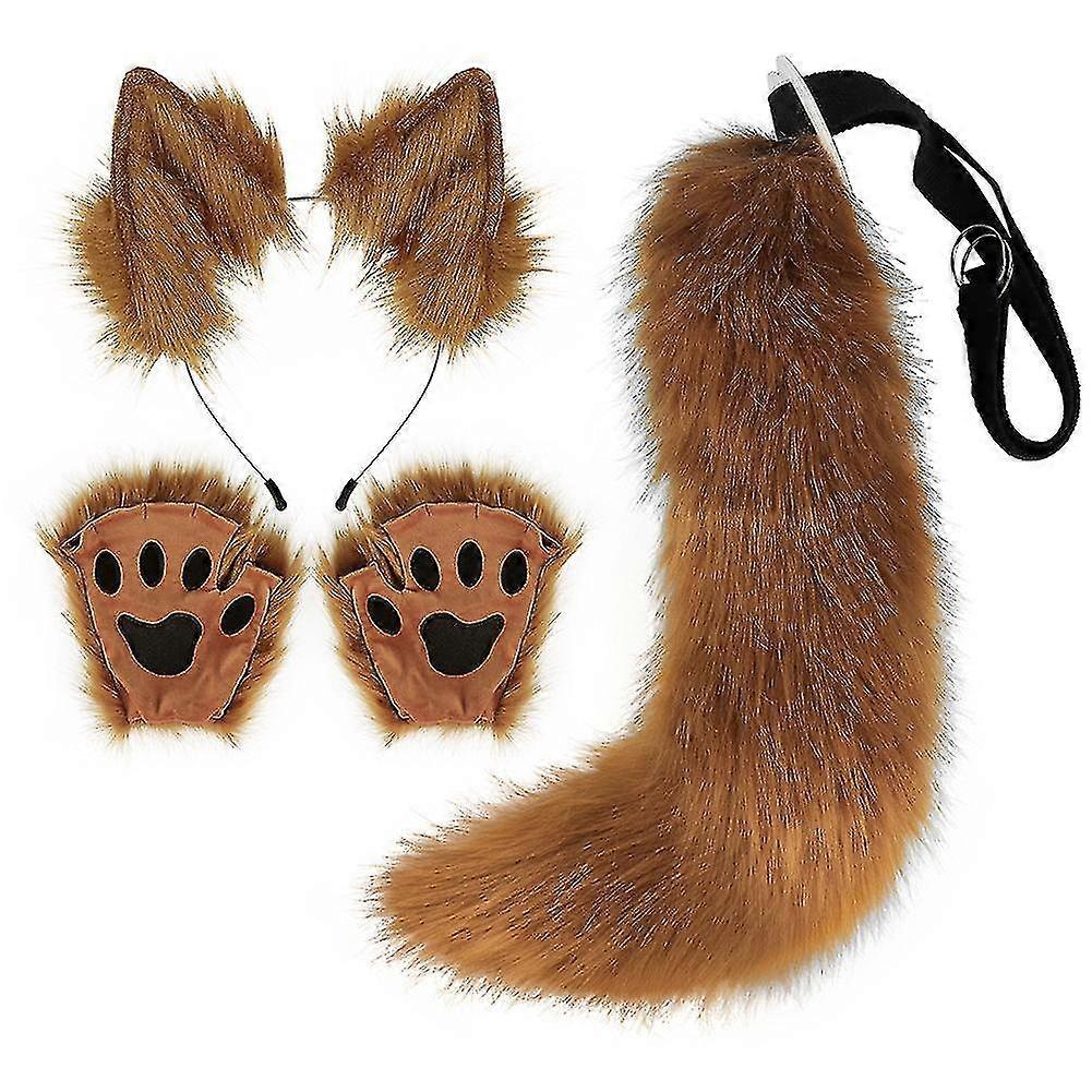 Faux Fur Fox Tail Cat Wolf Cosplay Costume Set Plush Mask Fluffy Paw Gloves Halloween Christmas-hao