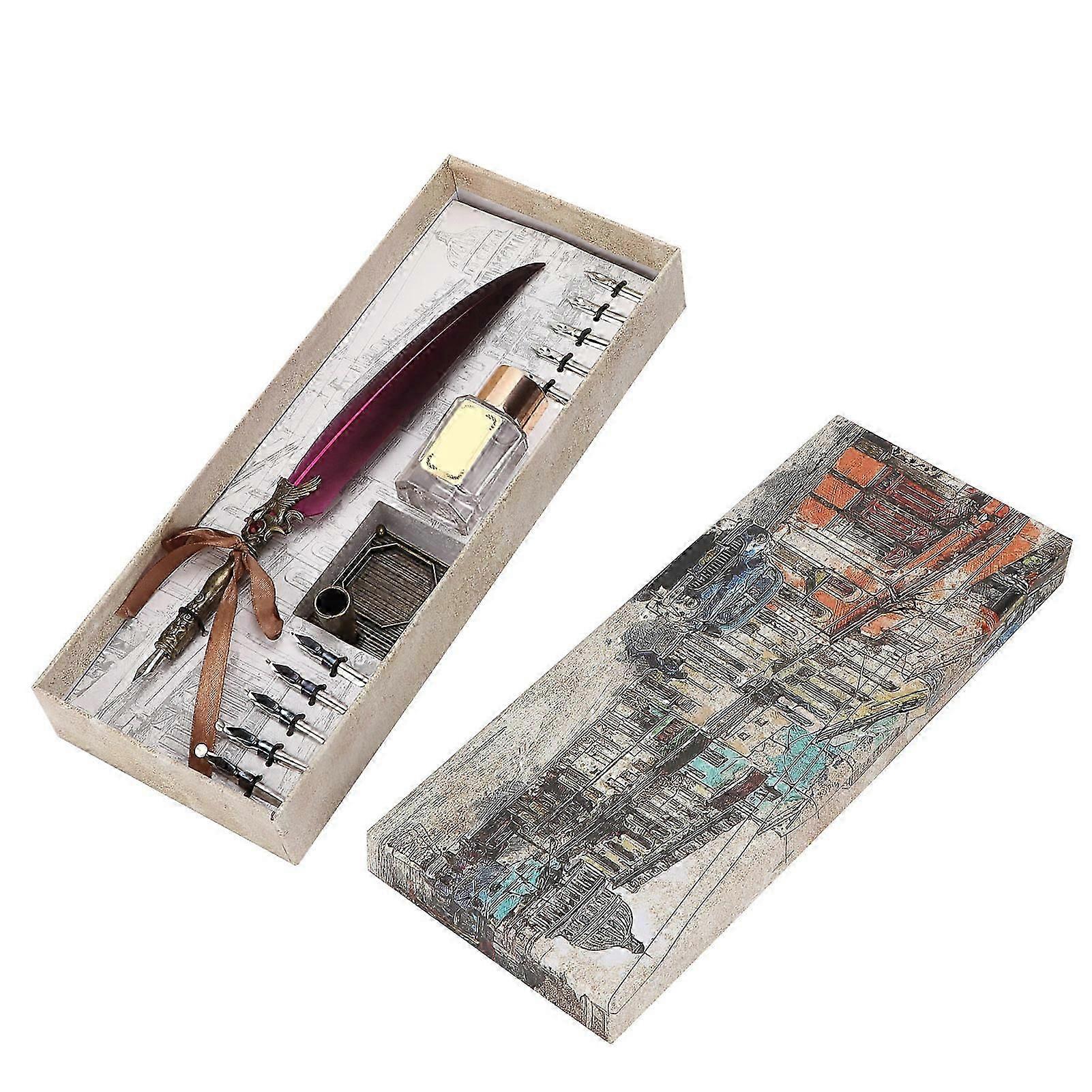 Feather Pen Set Vintage Creativity Ink Carving Writing Suit for Lover Teacher Classmate GiftPurple