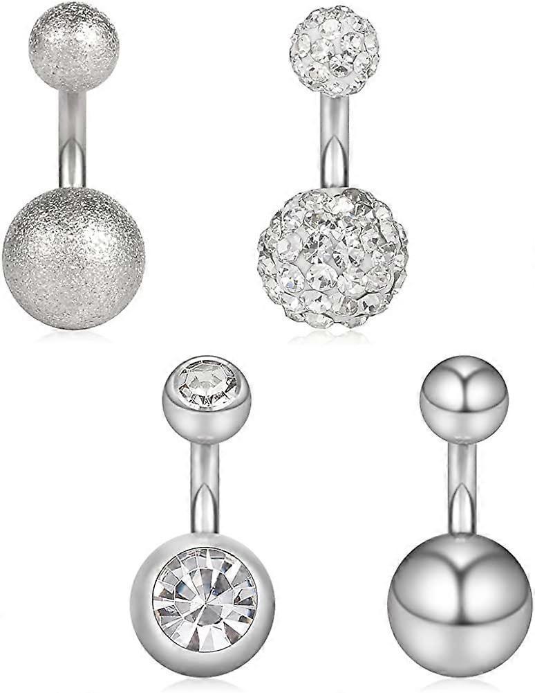 Durability These belly button rings are made to last, thanks to their sturdy stainless steel construction and durable cubic zirconia accents. Comfortable Fit Designed for shallow, thin piercings, these rings provide a comfortable, non-protruding fit for everyday wear. Packaging Each set includes four pieces plus a free velvet pouch, making it an ideal gift or value pack for multiple looks. Variety of Designs Comes in four distinct styles, including shiny balls, matte balls, double gems, and crystal ferido, offering various fashion options. Quality Material Crafted from 316L surgical steel and cubic zirconia, ensuring hypoallergenic and nickel-free wear for sensitive skin. Ease of Use With a gauge of 14G and a short 1/4-inch bar length, these rings are easy to insert and stay in place.