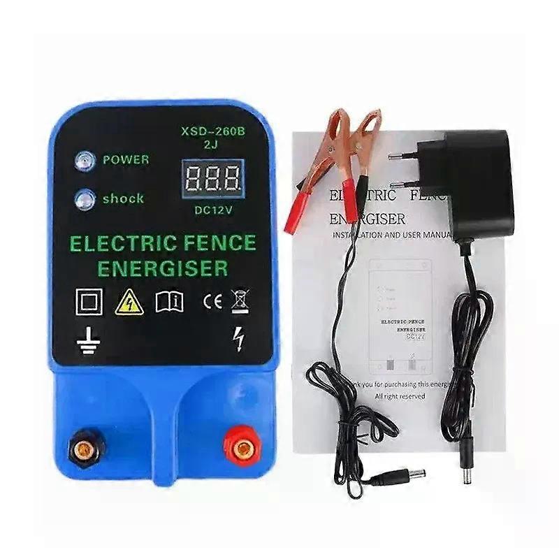 Specification: color: red/blue material: plastic voltage: AC 110v Input power consumption: 4.7W Pulse frequency: 0.5-1.5 seconds adjustable Output voltage: 8KV (medium voltage) -12kV (high voltage) Transmission distance: 10 kilometers Feature: 1.10KM control range] This fence energizer is specially designed for electric animal fences, which can control an area of 10KM, and 2. [Two terminals] This fence energizer comes standard with two terminals, one of which is a fence ground terminal for connecting to an independent grounding system, and the other is a fence output terminal for connecting to a fence. 3. Electronic digital display panel: LCD panel, voltage display, fully waterproof design 4. [Safety protection] Because the cable has undergone a series of strict tests, the device is safer and more reliable to use, and can prevent fires 5. Full waterproof design: it can be used when exposed to extreme weather, full waterproof design Package Contents: 1 x Electric Fence Solar Charger Controller 1 x Battery clip 1 x Power adapter _x000D_