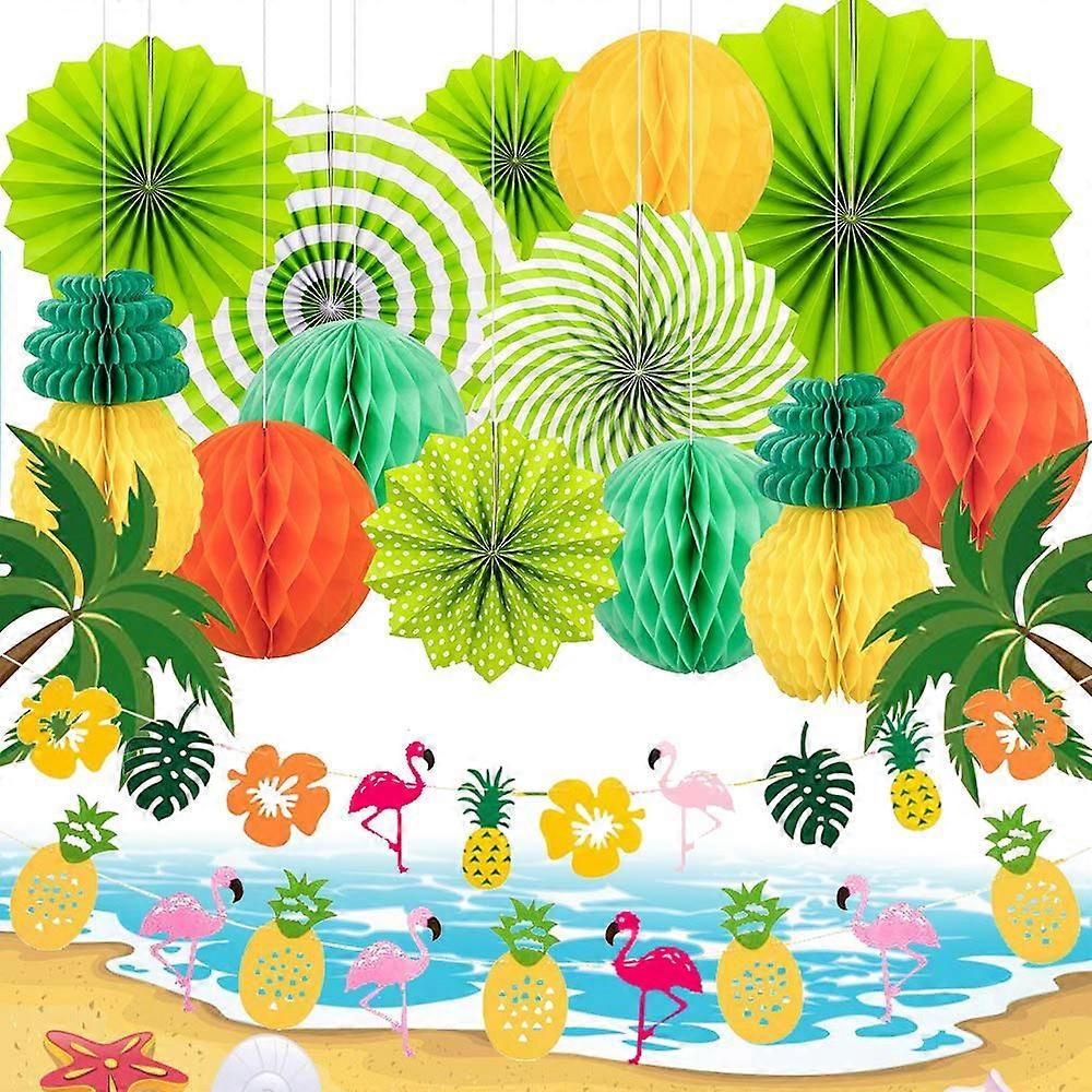 Flamingo Decoration Hawaiian Party Set, Hanging Fans, Leaves, Pineapple, Tropical Beach Garland