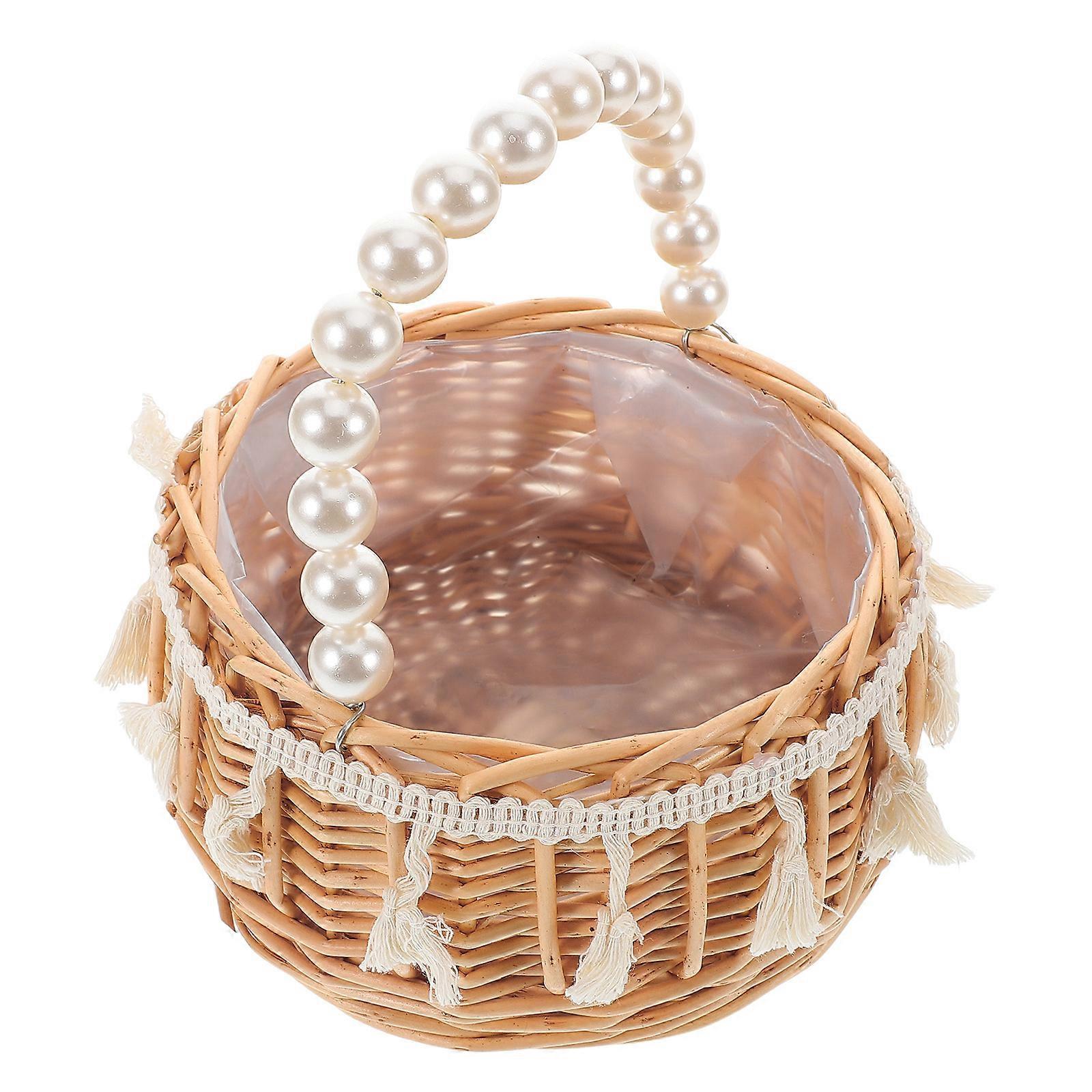 Brown Woven Basket with Simulation Pearl Handle for Flower Girls and Weddings Versatile Storage 10.5x8 Inches