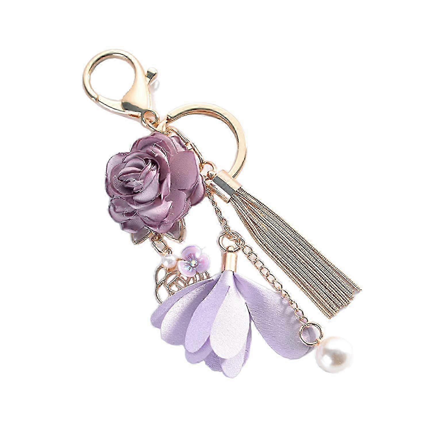 Flower Fringe Keychain Faux Pearl Car Key Ring Holder Wallet Handbag Pendant (Purple)