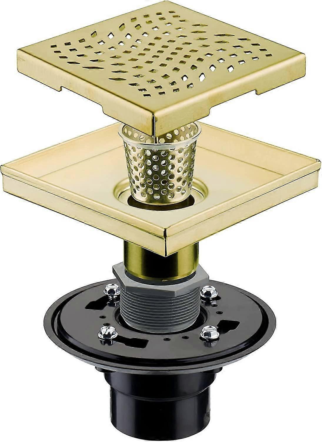Brass Brushed Square Shower Drain With Flange , 6 Inch Sus 304 Stainless Steel Gold Shower Floor Drain With Removable Hair Strainer