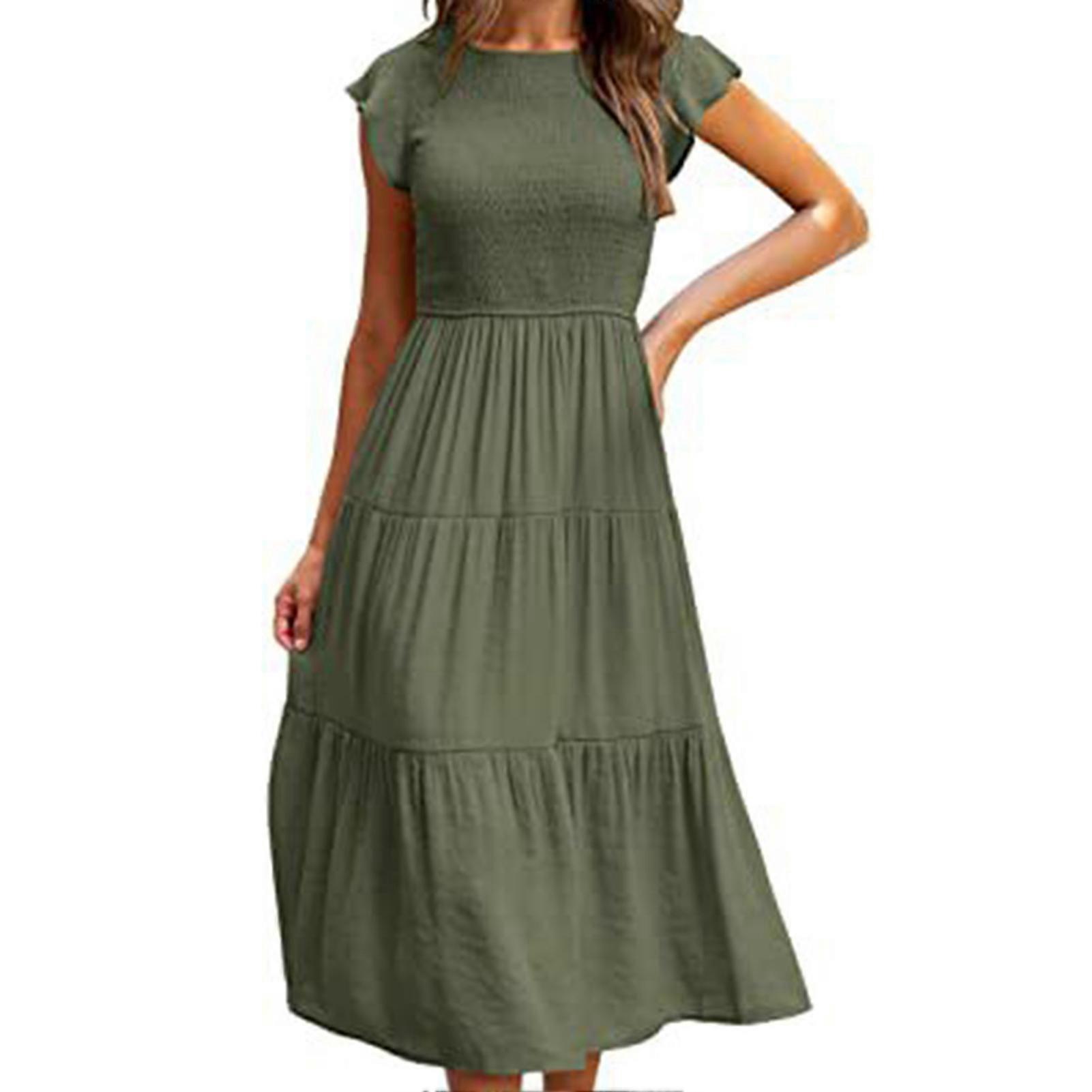 Ruffle Sleeve Long Dress Ruffle Hem Short Sleeve Round Neck Layered Dress for Women OD Green XL