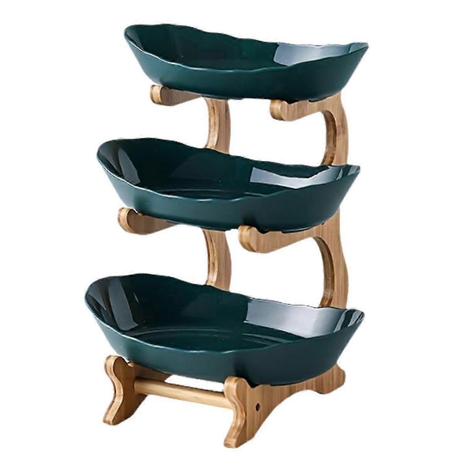 This serving rack creates a cute and space-saving way to hold your snacks, candies, fruit and vegetable salads, or any other food. Thicker and sturdier. The non-slip design of the bottom of the bowl is polished and will not damage the countertop. Durable, healthy and hygienic. Elegant appearance: The oval bowl combines value and practicality, with clever design and elegant style. The bowl has an elegant texture, creating a quiet and beautiful atmosphere. [Function and Decoration] The size and appearance are perfect for kitchen countertops and suitable for any style and decoration. [Sturdy] The fruit basket rack adopts a thickened frame with strong load-bearing capacity. Each basket is supported by four bracket bases, which is not easy to shake and can also prevent the table from being scratched. Elegant, perfect for snacks, fruits, cakes<br><br>layer: three Material: Wood colour: Dark green<br><br>Package Contents: 1 set x Fruit plate rack<br><br>Only the above package content, other products are not included. Note: Light reflection and different displays may cause the color of the item in the picture a little different from the real thing. The measurement allowed error is +/- 1-3cm.