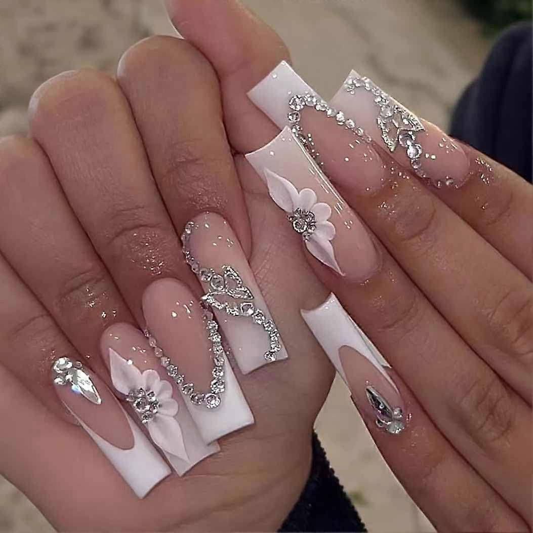 French Tip Nails Square Press on Nails Long Fake Nails with 3D Flowers White