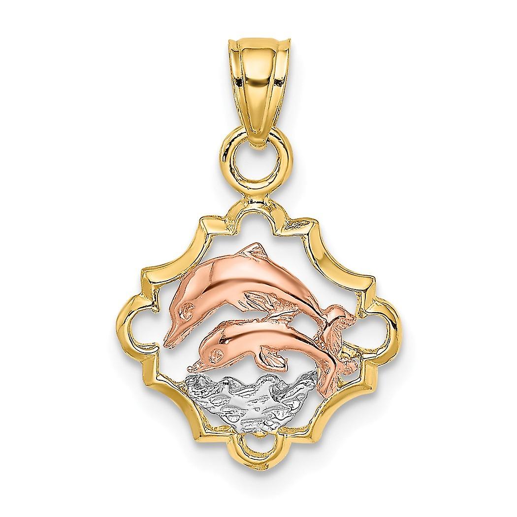 14k Two-tone Gold Double Dolphins In Frame Tri-color Charm - Measures 13.4x13.85mm Wide 2.7mm Thick - 1.0 Grams In 14k Yellow Gold - - Charm/Element Width: 13.85 mm - Charm/Element Thickness: 2.7 mm - Width of Item: 13.85 mm - Charm/Element Length: 13.4 mm - Length of Item: 13.4 mm - Bail Length: 5 mm - Bail Width: 4.5 mm - Finish: Polished - - This Item Does Not Ship With a Chain