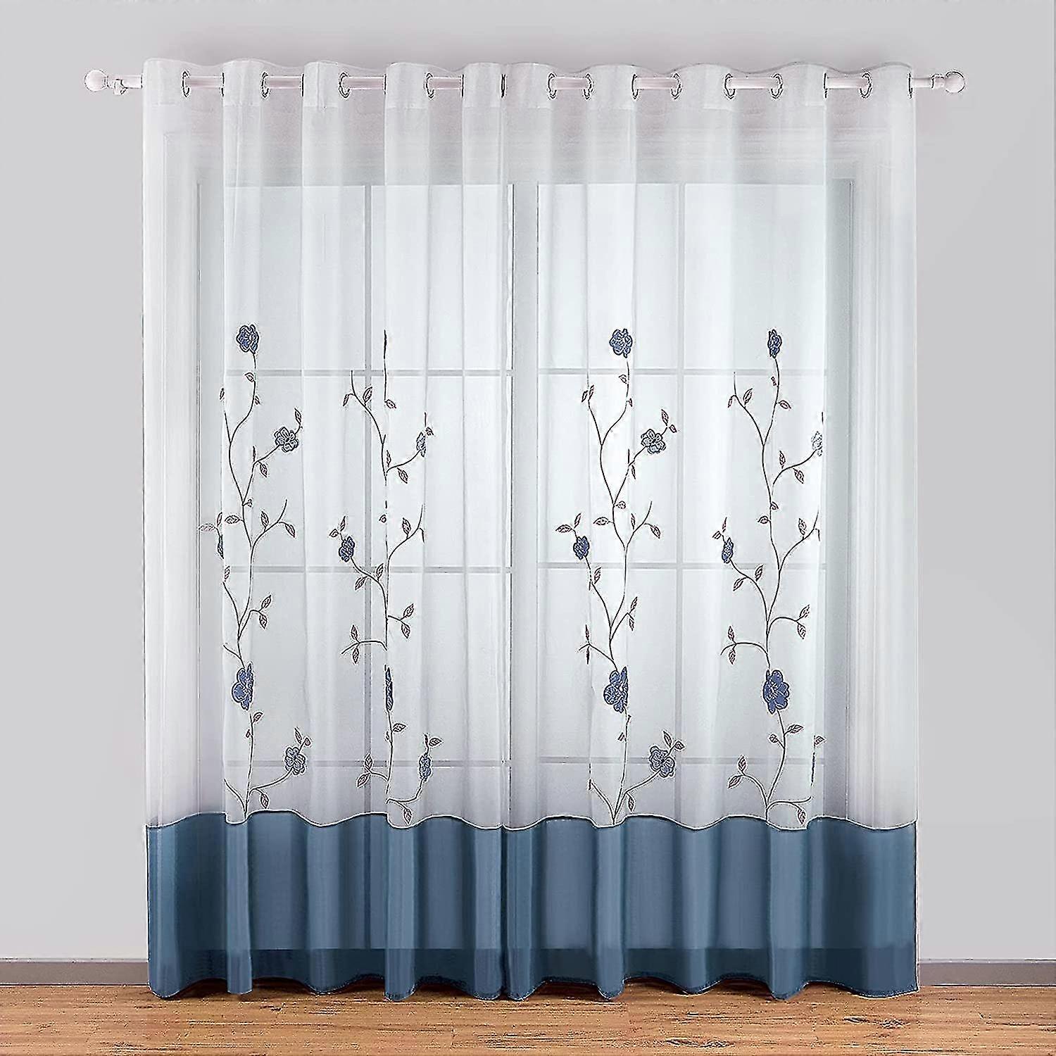Set Of 2 Floral Embroidery Sheer Eyelet Curtains For Bedroom Kitchen Living Room, 140cmx225cm, Blue