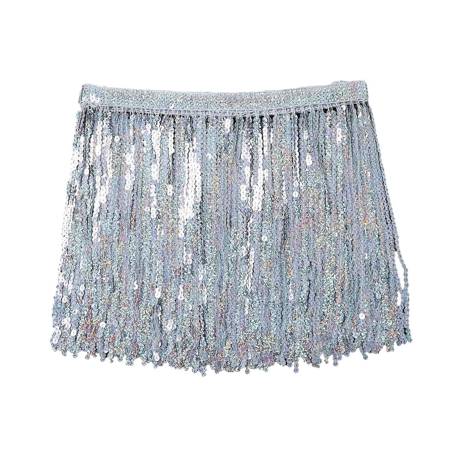 Belly Dance Hip Skirt Sequins Tassels Fringed Hip Scarf Elastic Waist Mini Skirts Rave Costume Festival Outfit for Women Silver XL