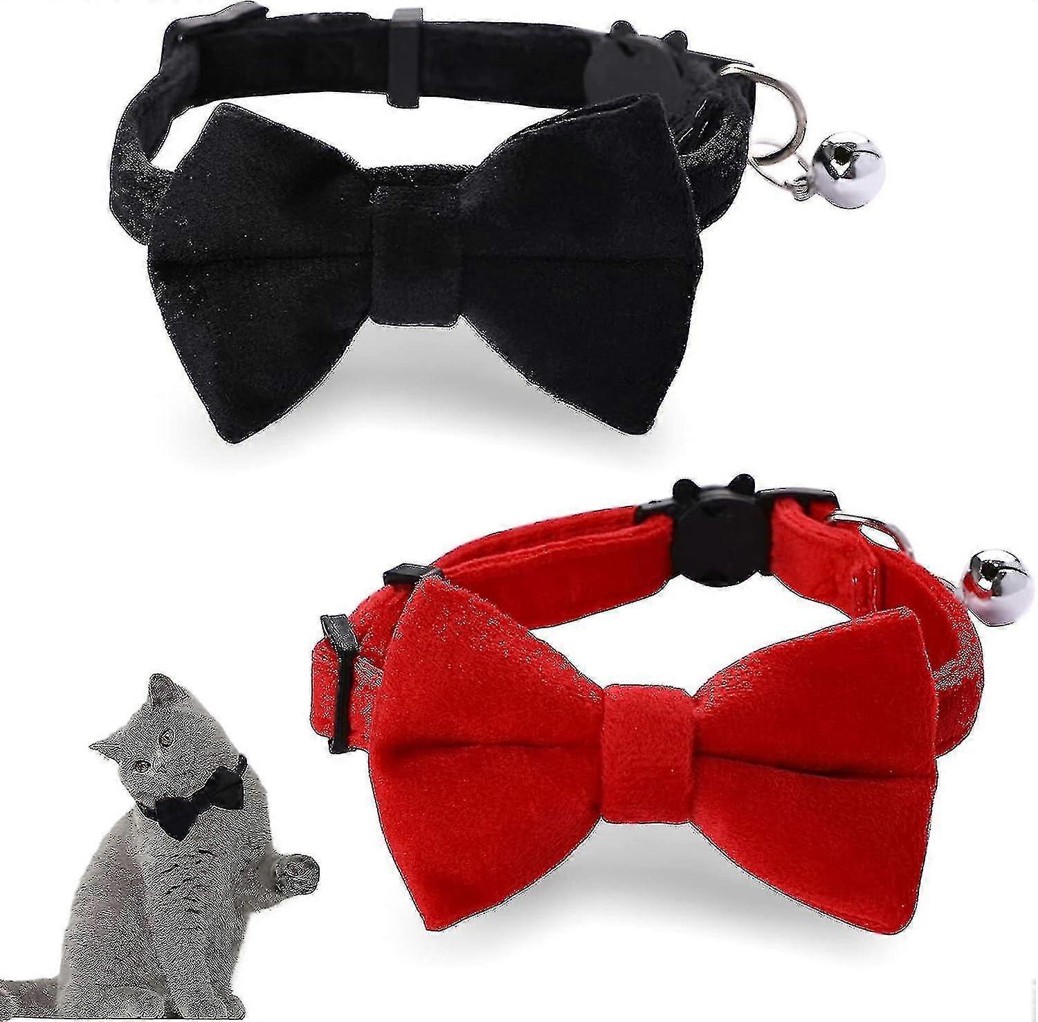 2 Pcs Adjustable Velvet Bowtie Cat Collar With Bell, Breakaway Design for Safety, Suitable for Small Puppies and Kittens, Solid Wedding Red