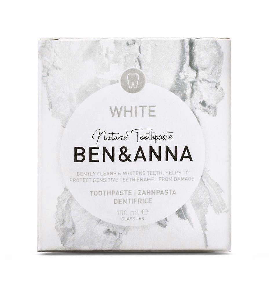 Experience a radiant smile with the Ben & Anna Whitening Toothpaste White 100ml, expertly crafted to combat discoloration and enhance your natural tooth brightness. This advanced formula combines the gentle yet effective power of sage, vitamin A, and antioxidants to provide comprehensive oral care.Infused with sage, known for its antibacterial properties, this toothpaste helps maintain a healthy oral environment by reducing harmful bacteria that contribute to plaque and bad breath. Vitamin A supports gum health and tissue repair, promoting overall mouth wellness. The rich antioxidant content works to neutralize free radicals, protecting your teeth from daily environmental stressors and helping to prevent tooth decay.Ideal for daily use, this whitening toothpaste not only helps remove surface stains but also strengthens enamel, ensuring long-lasting protection and a brighter smile. Suitable for individuals seeking a natural yet effective oral care solution, it fits seamlessly into any oral hygiene routine. Effectively reduces tooth discoloration and surface stains Protects against tooth decay with antioxidant-rich formula Supports gum health and tissue regeneration with vitamin A Maintains fresh breath and a clean mouth through sage's antibacterial action Gentle enough for daily use on sensitive teethTo use, apply a pea-sized amount onto your toothbrush and brush thoroughly twice daily. For optimal results, combine with regular flossing and dental check-ups. Embrace a cleaner, healthier, and whiter smile with this thoughtfully formulated toothpaste designed to meet your oral care needs.