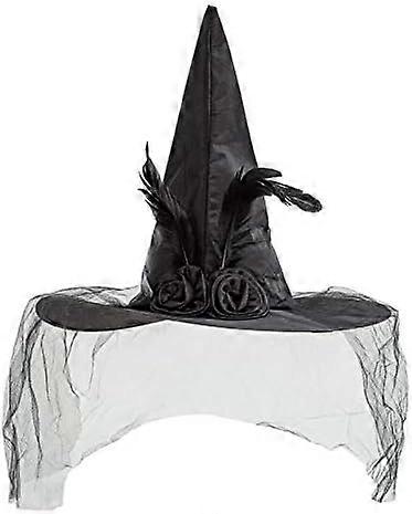 Ladies Black Witch Hat with Veil and Feathers - Halloween Day of the Dead Corpse Bride - Adults Pointy Witch Hat - Fancy Dress Carnival Accessories -