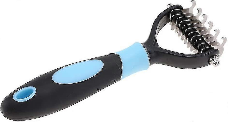 Rounded teeth provide gentle and precise hair removal for dogs with sensitive skin. The curved blade design does not scratch the skin like other sharp-edged tools.QUALITY MATERIALS - Dog grooming rake, made of stainless steel double-sided blades, is sturdy and durable.Eco-friendly ergonomic handle for a comfortable hand grip.QUICKLY REMOVE LOOSE TANGLED HAIR FROM PETS - Easy and fast, also tackles hard to handle mats and stubborn tangles.Ideal for grooming and daily massage to give your pet's coat a shineColor: BlueSize: 7.2*17.3cmProduct List: 1*comb