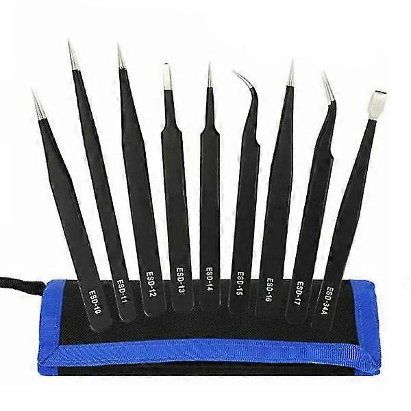 【MULTI-FUNCTIONAL TWEEZER SET】This tweezer set includes 9 different specification tweezers and a storage bag to meet your various needs. It can be used for circuit board repair, watch repair, crafts, jewelry making, electronics, laboratory work, beauty brow shaping, eyelash application, hair removal, and so on. 【ANTI-STATIC】Each tweezer has a resistive ESD coating to prevent static electricity from damaging electronic components. Suitable for assembling, developing, or repairing electronic and computer parts. Prevent static electricity from damaging sensitive electronic equipment. 【DURABLE, RESISTANT AND NON-CORROSIVE】The precision tweezer set is made of durable stainless steel with an anti-static and non-magnetic paint on the surface and is resistant to most acids and other corrosive substances. Heat treatment and hardening make the tweezers highly elastic. 【DOUBLE-ENDED METAL SPUDGER】Sturdy and durable, and the plastic design on the middle part is non-slip, providing stronger control. The plastic pad is thin and flexible. 【PORTABLE AND SAFE】It comes with a storage bag and 9 professional anti-static stainless steel tweezers are included in the package. Each stainless steel tweezer has a suitable plastic protective sleeve, which provides full protection for these tweezers and is easier to store and carry.
