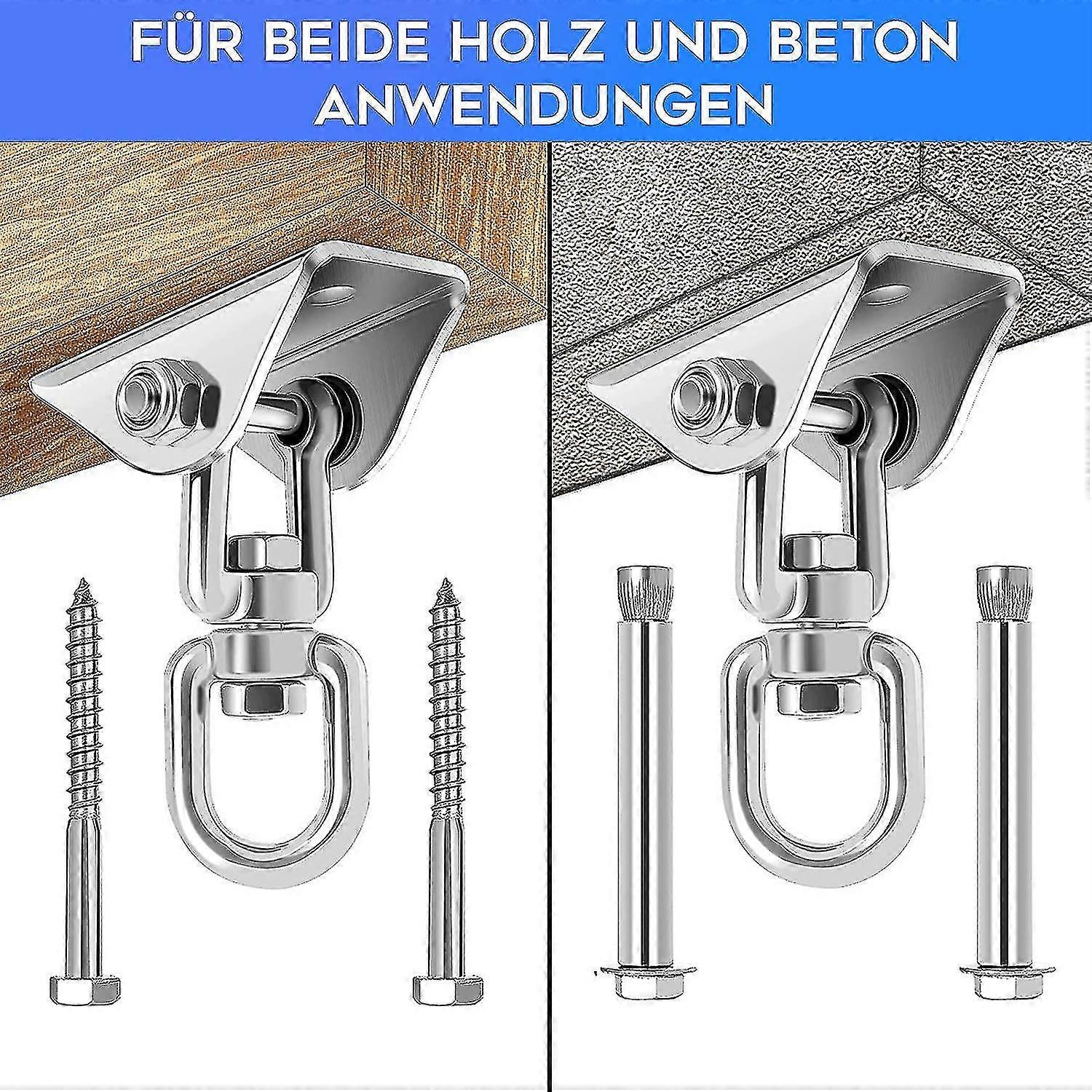 Indoor & Outdoor Use: Perfect for swings, porch swings, seesaws, sandbags, or anything heavy hanging from the rack. Corrosion resistance, high hardness : The 304 stainless steel ring is made of high quality raw materials. No rust, corrosion resistance, high hardness, non-toxic and non-polluting environment. Easy to install: We pre-drilled two holes for bolting on wooden or concrete beams . Includes 2 concrete anchors and 2 hex lag bolts, and a unique one-piece design that sets up in minutes. Rotatable Design: Innovative design makes use more flexible and wider. such as playground swings, porch swings, or ham swings Safe and Sturdy: Count on these high-quality swing hangers to safely support children and adults alike.