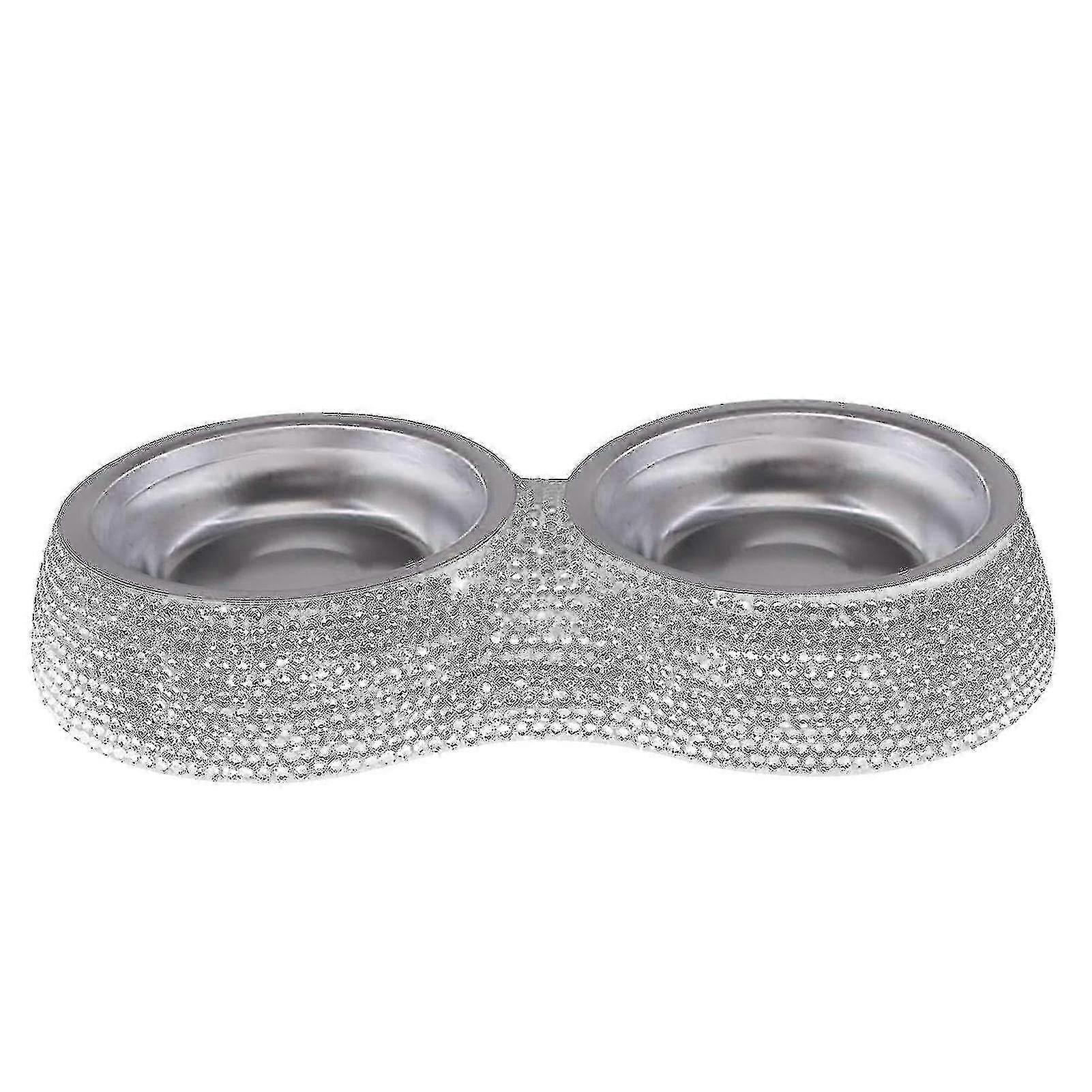 Rhinestone Dog Bowls Stainless Steel Double Food Feeder Pet For Puppies Features:Large Capacity: This Rhinestone Dog Bowl has a total capacity of 320ml and can hold up to about 4.5oz. It works well with dry food water wet food or snacks.High-Quality Material: Made of high-quality stainless steel this Pets Bowl is bite-proof shatter-proof not easy to rust easy to clean can be used for a long time and safe for your pets.Non-Slip Design: This Pets Bowl has a rubber ring on the bottom to prevent spills and reduce noise and prevent the bowl from sliding around while pets are eating.Shiny Look: The appearance of the Dog Bowl is covered with high-quality rhinestones which are more beautiful shiny and high-grade it is the best choice for your pet food bowl.Wide Range of Application: Perfect Rhinestone Cat Bowl suitable for most small pet dogs and cats. Give your beloved pet a good time to eat. Double bowls also allow you to feed two pets at the same time. Specification:Name: Pets BowlCapacity: 320ml (160ml per bowl)Crystal Rhinestones: 1000+ piecesDrilling Process: handmadeBowl: About 1.2"/ 3.05cm (height) 4.7" / 11.94cm(diameter)Rhinestone Tray: About 10.2"(L)* 5.6"(W)/ 25.91cm (L)* 14.22cm (W)Material: Stainless steel bowl + rhinestone trayNote: 1. Due to the lighting effects and shooting angles there is a color difference in the product please understand. 2. Due to manual measurement there is a tolerance in the product size. includes: 1Pet Bowl"