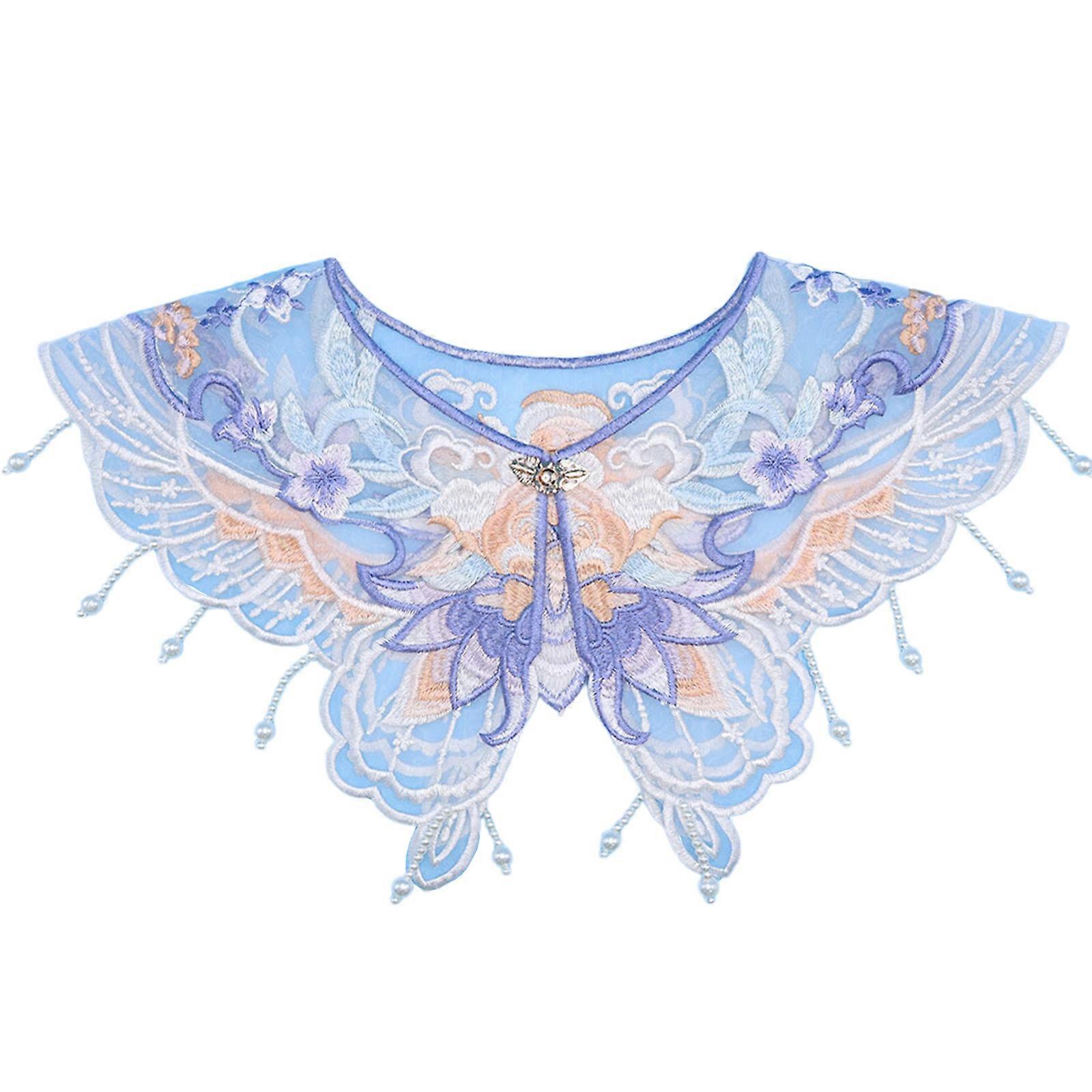 Buttoned Embroidery Butterfly Shoulder Cape for Women's Decorative False Collar Chinese Pearls Tassels Yunjian Shawl blue button beading