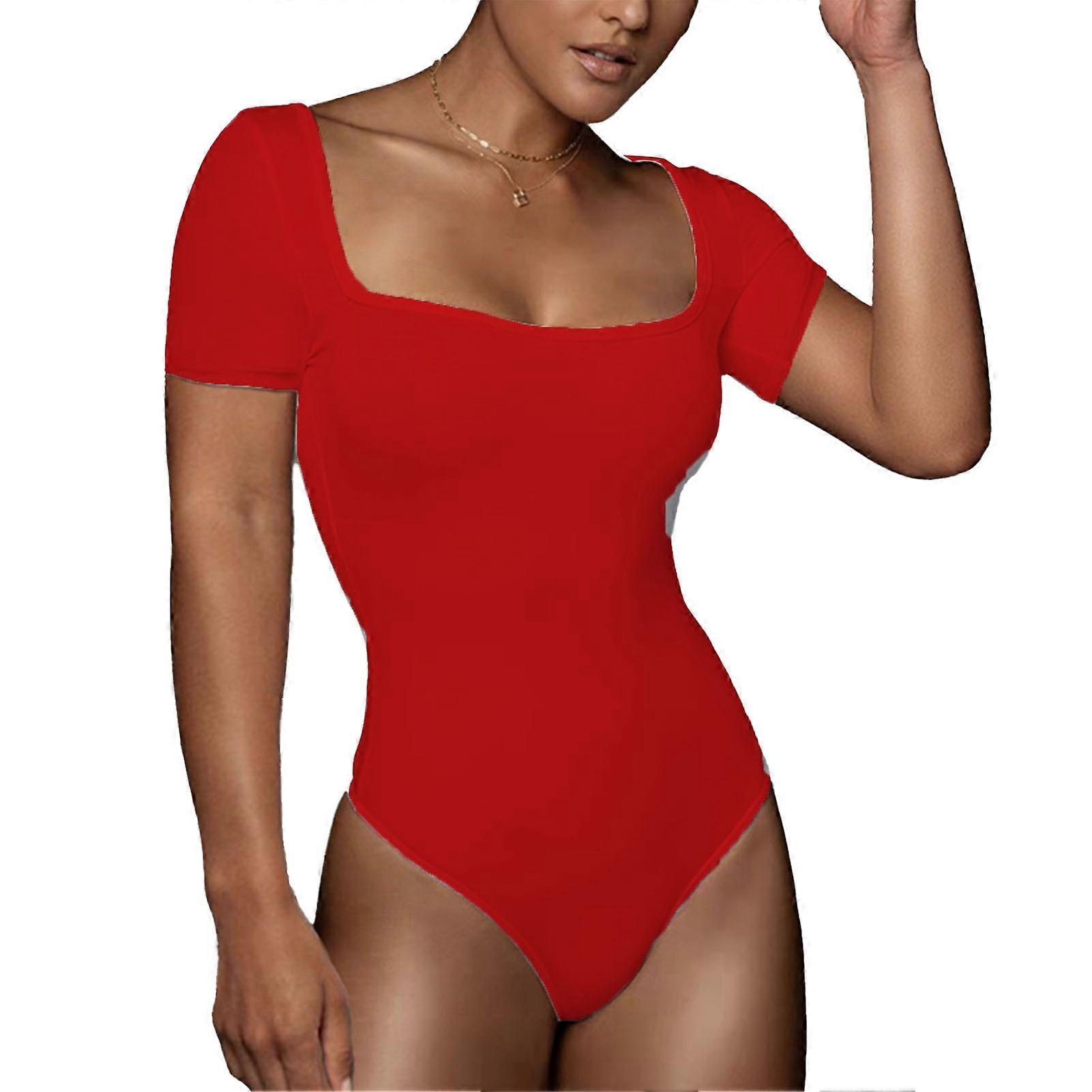 Bodysuit Pure Color Slim Fit Short Sleeve Fashionable Elegant Stylish Women Bodysuit for Dating Red M