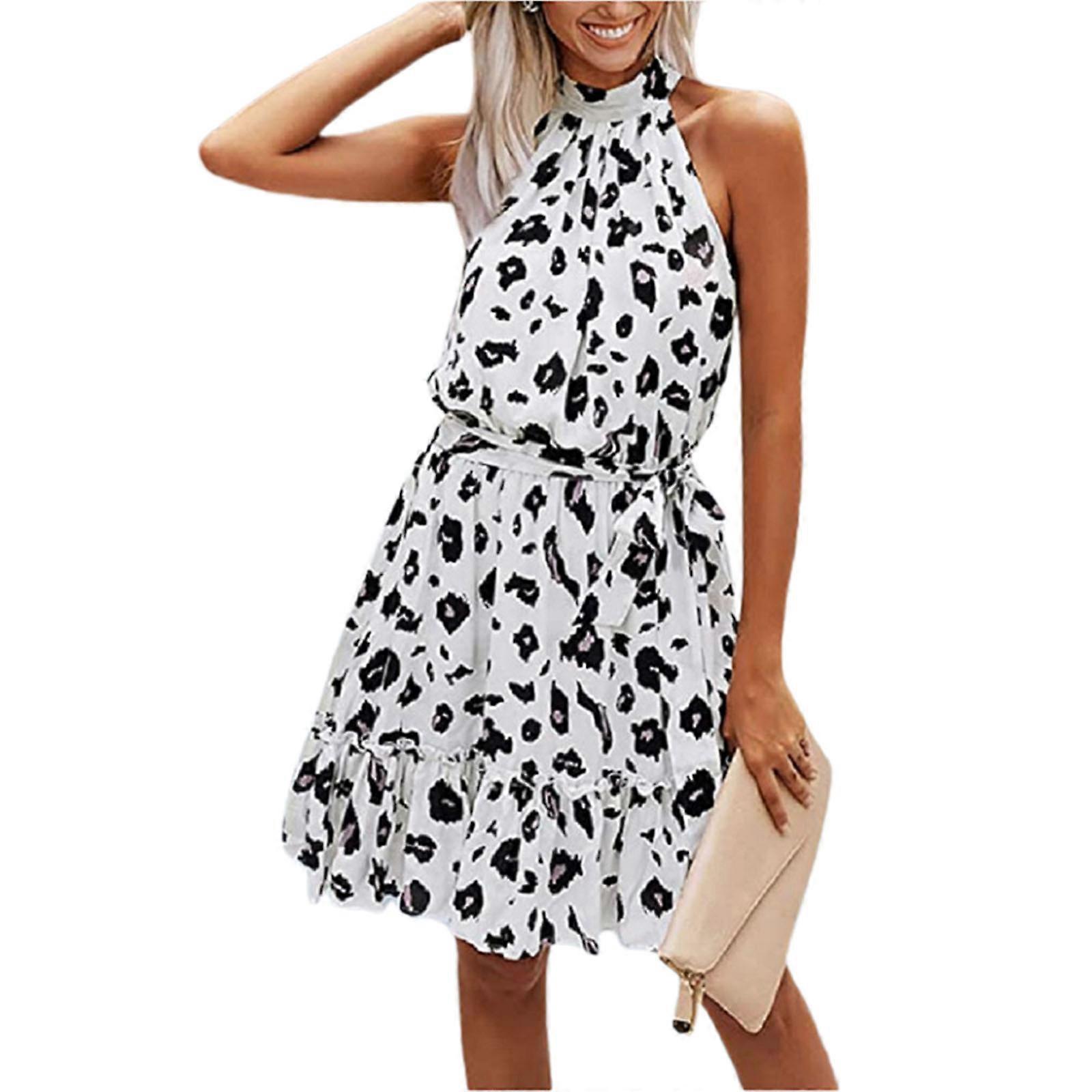 Bohemia Neck Halter Dress Floral Printed Dress 2023 Summer Women Sleeveless Travel Vacation Holiday Knee Length Dress White XL