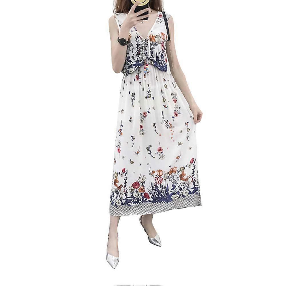 Bohemian Style Women O-neck Floral Printed Sleevless Empire Waist Long Dress(#2, 3XL-4XL)