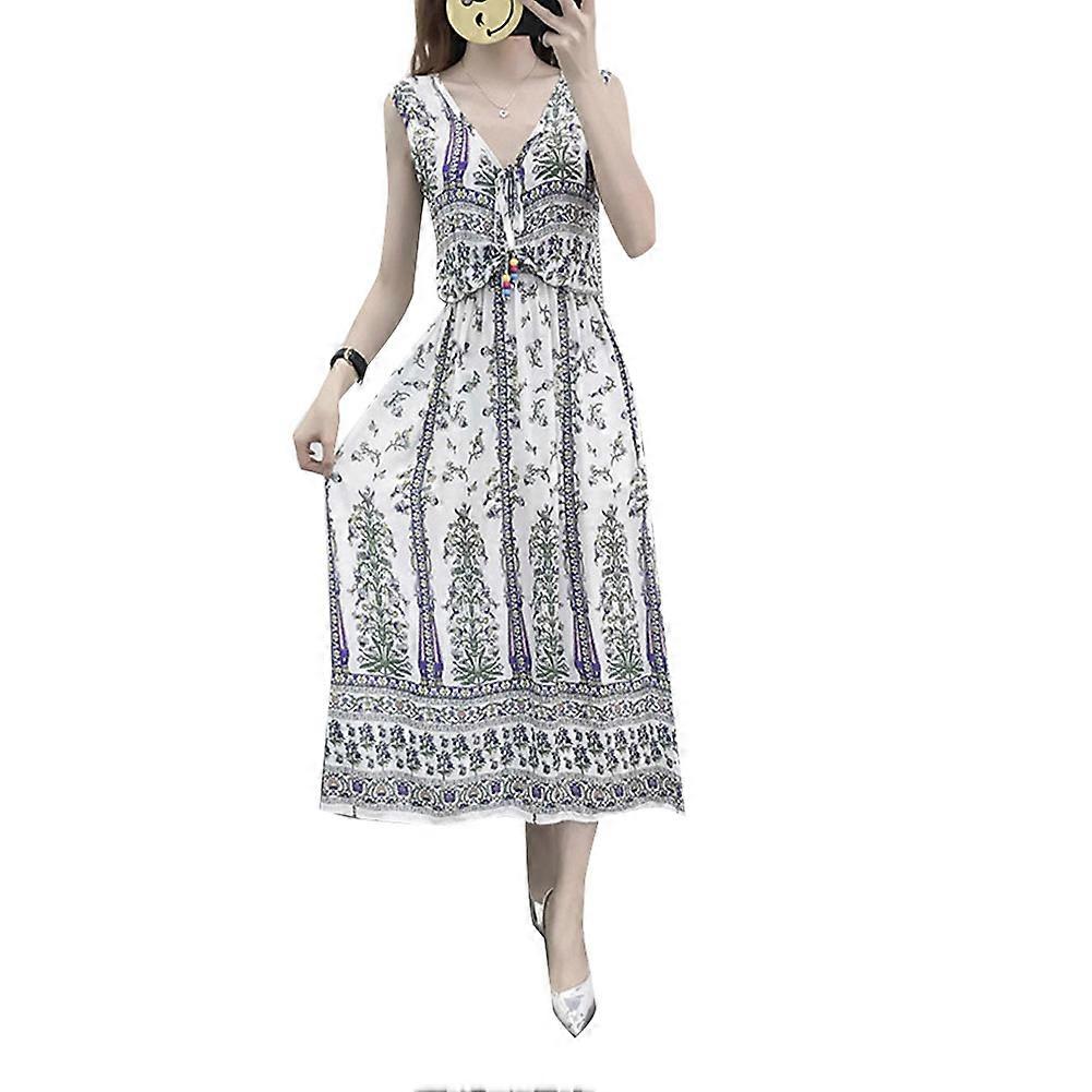 Bohemian Style Women O-neck Floral Printed Sleevless Empire Waist Long Dress(#3, 3XL-4XL)
