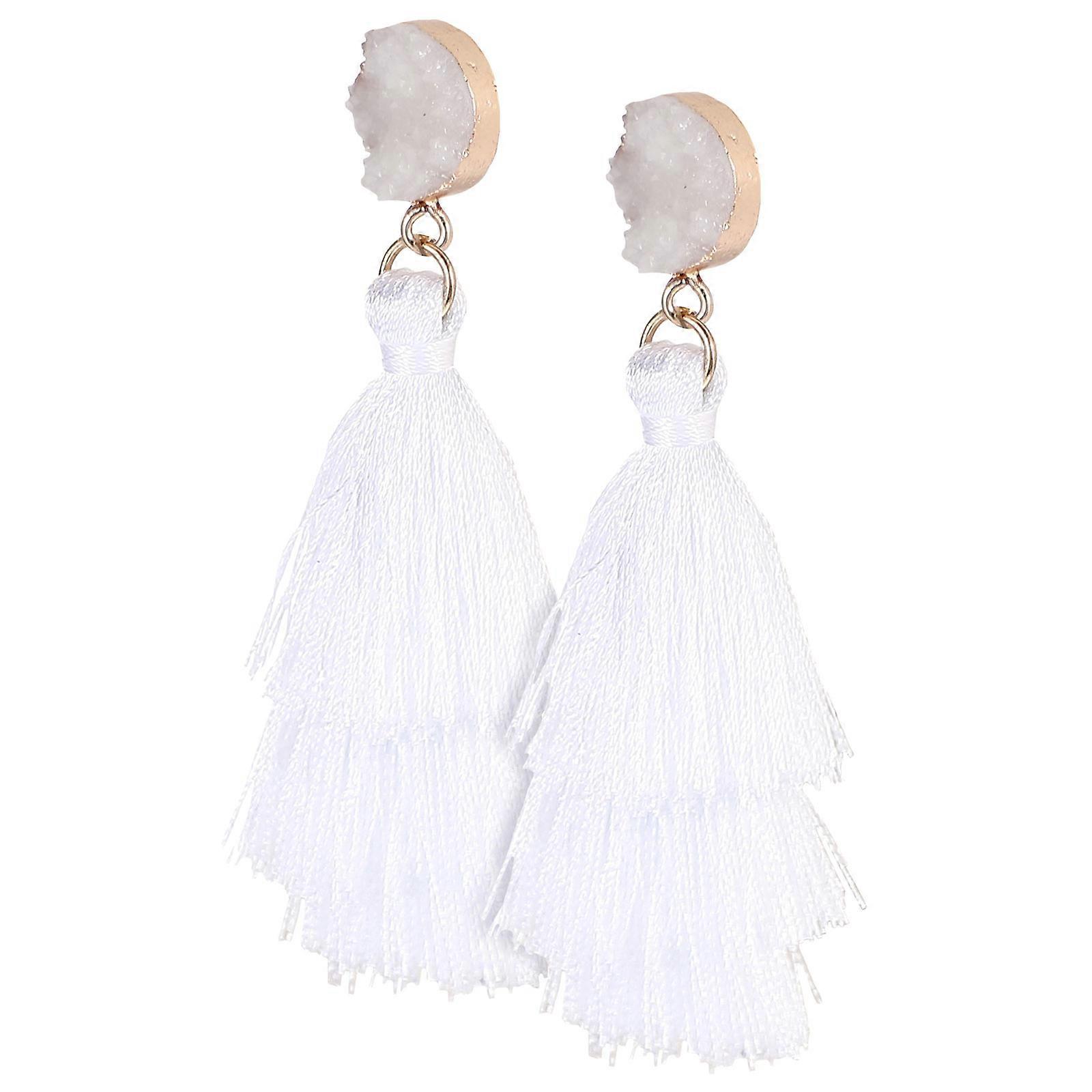 The decorative earrings are manufactured with durable material for use. The fashion bohemian style layered tassel ear decors will make you look more unique and charming. Also, they can be considered as great gifts for your family and friends. Features - Color: White -Material:Alloy, cotton tassel, crystal - Size: 9.00X3.00X3.00cm/3.54X1.18X1.18in -Chic crystal beads earrings with 3 layered tassel designed, wearing it will show your unique fashion taste. -The appropriate size of the eardrop will make you wear more comfortable, chic and delicate, easy to take on or off. -The fashion earrings for women are eye-catching, charming and vibrant, fit for different occasion use in life. -It can match with different dresses and suitable for daily wear, dating or other occasion you want to be more charming. -These earrings are wonderful compliments for you in the party, banquet, wedding, dating, etc., let you outstanding in the crowd. Package list: 5 x pair of earrings