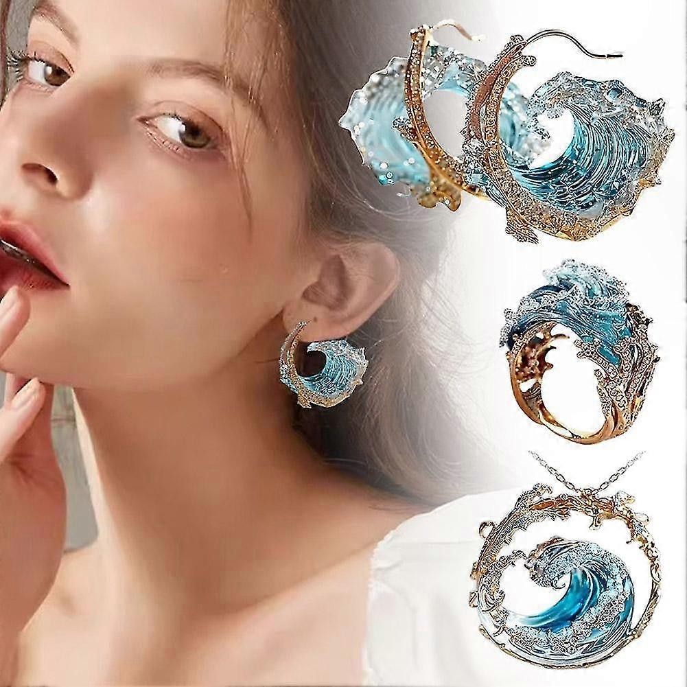 Boho Blue Wave Jewelry Set Necklace Earrings Rings Ocean Inspired Gift Idea