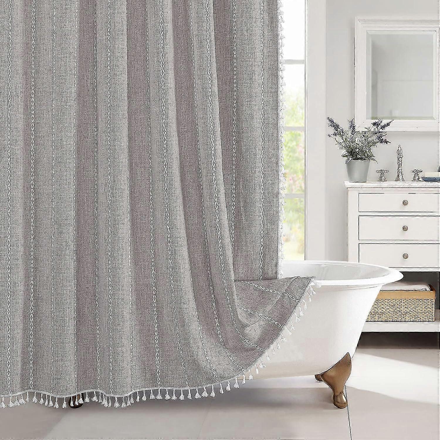Boho Farmhouse Fabric Shower Curtain Set, Brown Grey Modern Cotton Linen Shower Curtains For Vintage Rustic Bathroom Decor, Country Tassel Thick Cloth