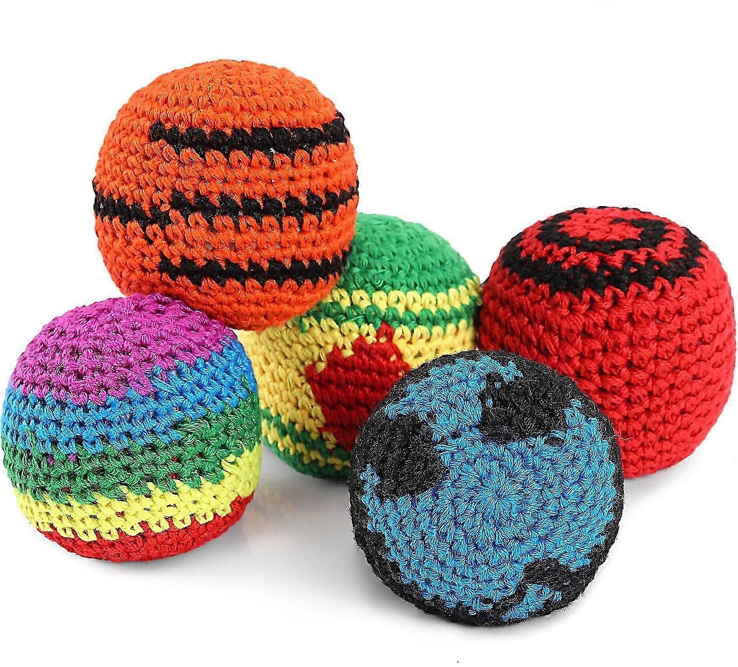 Quantity: comes with 5 pieces woven kickballs in random color, each one measures approx. 6 x 5 cm/ 2.36 x 2 inch (L x W) and the weight is approx. 32 - 50 g (hand weaving exists a little error) US: Material: the balls are made of knitted and filled with a mixture of foam and ceramsite pellets, light and soft enough to play for children, suitable for children above 12 years old Material: these balls are made of knitted and filled with a mixture of foam and ceramsite pellets, light and soft enough to play for children, suitable for children above 14 years old Durable to play: have a sturdy construction and stitching well, won't easily come loose, convenient to pick up and won't roll fast or bounce away Fits for: these juggling balls are suitable for most people, also a nice gift to share with children, students, family, friends and also as rewards for fun party favors or carnival prize Funny and practical tool: playing with balls can exercise children's muscles, develop their hand-eye coordination, also practice their reaction capacity