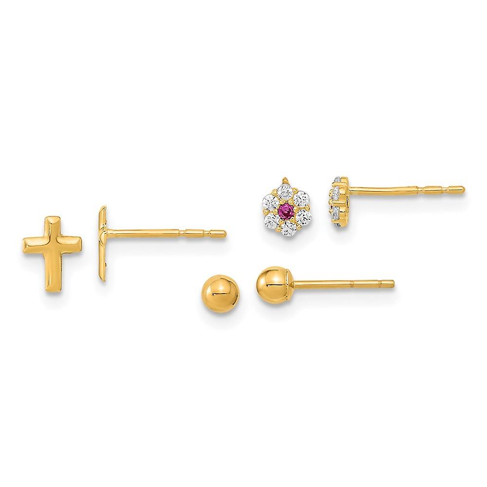 14k Gold Polished Set Of Ball Post Cubic Zirconia Flowers and Religious Faith Cross 3 Pair Earrings-Set 6-Ball Earring f