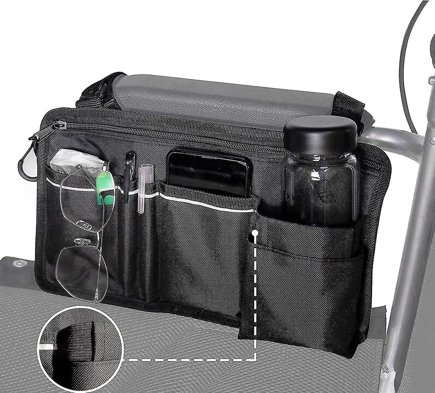 4 Pocket Designe Our wheelchair bag with a large zipped compartment as well as 3 open pockets to fits lots of common small items, paper towel, pill box , water bottle, phone, etc Keep Items Within Arm'S' ReachOur wheelchair pocket hangs perfectly on the rail of hospital bed or wheelchair armrest so you can keep all your things organized and not have them falling on the floor which is great convienence for elderly, disabled Adjustable Magic Sticks Waterproof Fabric The magic sticks are adjustable to fit around your mobility scooters', universal wheelchair' and electric wheelchairs arms so the pouch will not often come undone, and our wheelchair bags are made of waterproof material that you can go shopping and travelling with the pouch Reflective StripA reflective band on the back of the universal wheelchair bag to increase visibility at night and enhance security