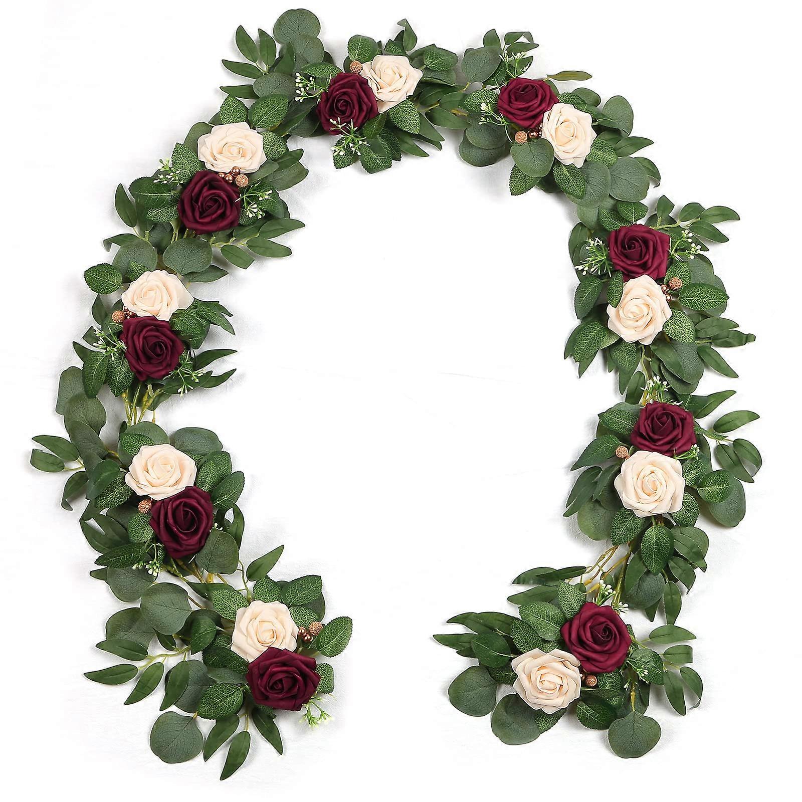Ponatia 6ft Burgundy Roses Artificial Flowers Garland Eucalyptus Flowers, Wedding Table Wreath
