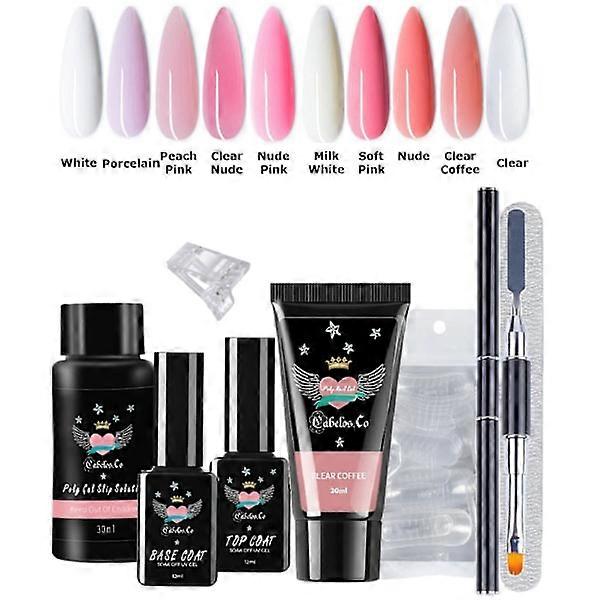 Polygel Nail Kit (30g) This 7-piece Polygel Nail Kit lets you create trendy nails at home, including ombre, French, encapsulated, and baby boomer styles. All poly builder gels are popular colors, making it easy to create your own unique nail art. Polygel is easy to apply and build, shaping easily in dual forms and smoothing when applied with Slip Solution or alcohol. With proper nail preparation (filing, buffing, polishing, and cleaning), Cabelos Polygel Nails can last for a month or more. No harsh ingredients or glues to damage nails; safe and odorless. Cures in 60 seconds under a UV lamp or 90 seconds under an LED lamp. For best results, use a UV base coat and top coat. Note: Clean the natural nail before applying polygel. Avoid skin contact; remove immediately if contact occurs. Kit Includes: 1 x 30g Polygel 1 x 12ml Base Coat 1 x 12ml Top Coat 1 x 30ml Slip Solution 100 x False Nails 1 x Cuticle Pusher/Nail Brushes 1 x Nail File 1 x Polygel Nail Clip 1 x Manual