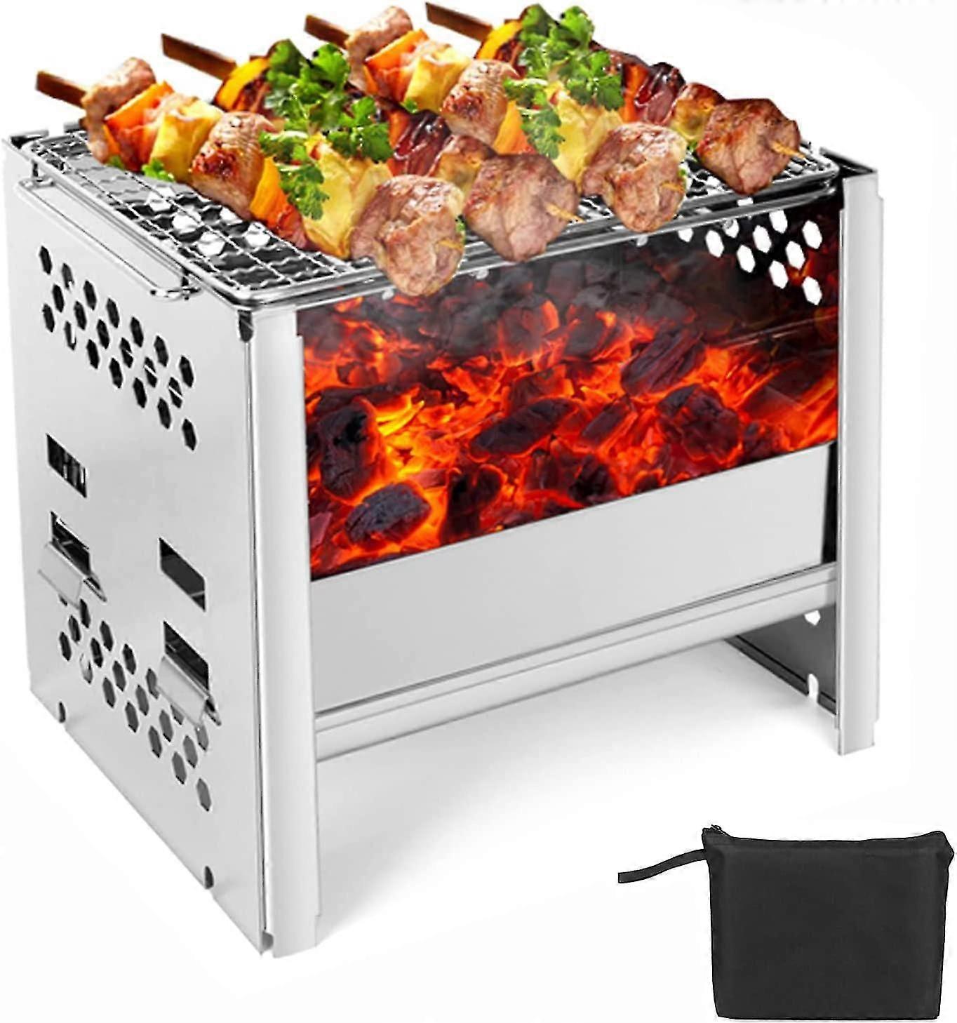 SMALL FOLDABLE SIZE WITH POUCH AND GRILLE GRID - Easily foldable into a compact size (8" x 6" x 1'') and packed in the carry pouch for convenient storage. Light weight at just 2 lbs. Bonus 1 grill grate, it makes outdoor barbecuing easier. MULTIPUL USE - This upgraded wood camping stove can be used as a wood burning stove, barbecue and baffles. What's more, it supports various cooking methods, like wood burning, charcoal, butane stove rack and alcohol stove rack, etc. STURDY STAINLESS STEEL - Made of steel High-grade stainless and featuring a pan support system, the stove creates a stable cooking platform and evenly distributes. This portable camping stove will burn steadily no matter how heavy or how hot it gets. HIGH THERMAL EFFICIENCY - Pocket gussets and air vents for good ventilation and efficient burning. Secondary combustion allows the wood stove to continue burning for 20 minutes with dry firewood and wood chips. STABLE AND SAFE - The grid support plate creates a stable cooking platform, the cuboid design makes the product more stable and provides reliable support for kitchen utensils.