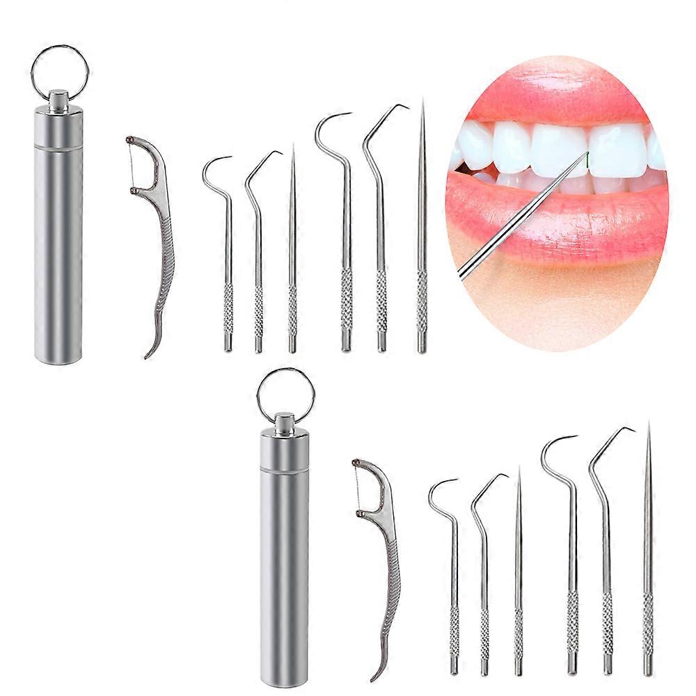 1.MaterialOur 7-in- toothpicks set are made of stainless steel , providing nice durability and anti-corrosion performance to keeping your teeth clean.2.Easy to CarryComes with keychain loops and you can take it to anywhere, lightweight and easy to carry. Good for camping, hiking, picnic,travel day-to-day use.3.Easily Remove the ResidueIt is more in line with the human oral structure design, and the 7 shapes can easily remove the residue! It can clean any place and remove tartar easily.4.Unique DesignThe toothpicks with dental floss are comfortable to grip, not easy to slip from your hand; The bottom tip of toothpick is not too pointed, which will not easily hurt your gingiva.5.Multifunctional Our pocket toothpicks with different designs can help you open the phone slot, clean up the computer keyboard block particles residual,meeting your different needs.