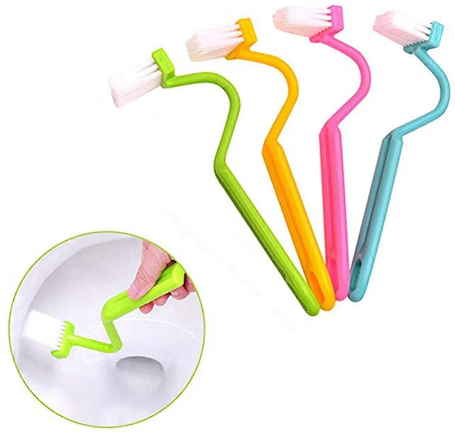 V-Shaped Brush DesignErgonomic curved handle that reaches deep into the corner you can't see. Clean the blind spot that straight brushes can't reach. Flexible and ConvenientSmall, soft and dense bristles, very flexible, can clean the dirt thoroughly, cleaning becomes easy and fast. MultipurposePerfect for cleaning gas stove, sink vent, floor drain, sliding door rail, toilet corner or other small corners. Built in a hanging holeBuilt in a hanging hole to keep it dry and clean in daily use. Package Includedl:4 x Toilet Cleaning Brushes; Size: approx. 20.5 cm (total length); Brush head size: 3 cm; Random color.