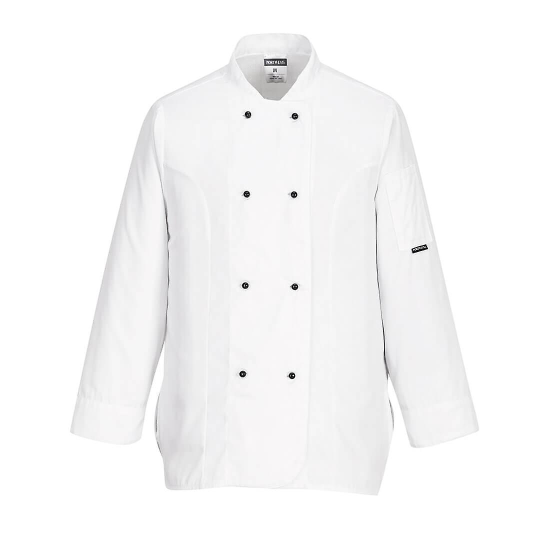 Not only does this jacket boast superior styling with its French cuffs and a sleek, reversible front with four rows of detachable poppers, but it also prioritizes practicality with a handy sleeve pocket for essential tools. The durable twill fabric is pre-shrunk to maintain the jacket's shape wash after wash, ensuring long-lasting wear and excellent dye retention. With a single pocket for secure storage and the added benefit of MeshAir™ aerated mesh gusset for increased ventilation, the Portwest C837 Rachel Ladies Long Sleeve Chef's Jacket is the perfect blend of elegance, comfort, and utility for the professional woman chef.