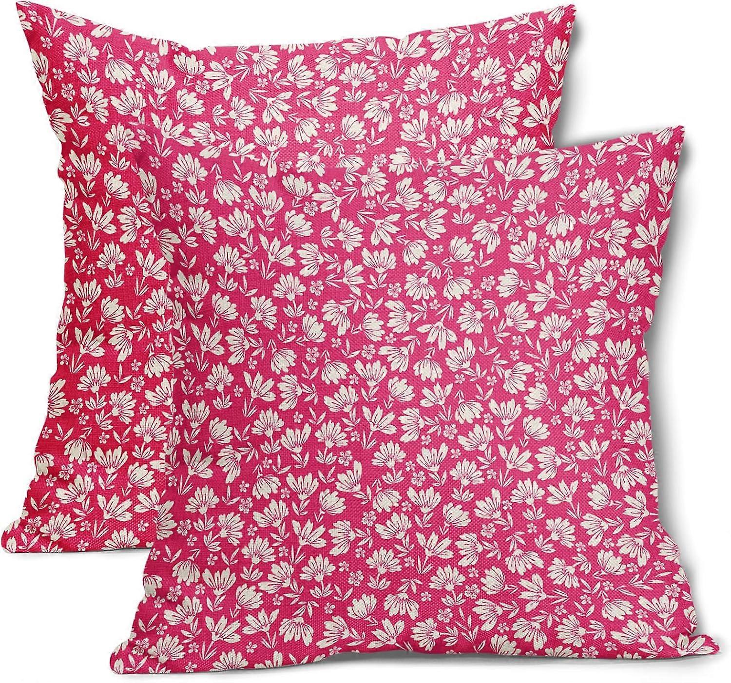 Hot Pink Beige Daisy Floral Pillow Covers 20X20 Inch Vintage Flowers Decorative Pillow Cases Set of 2 Preppy Block Print Cotton Linen Throw Pillows Fa