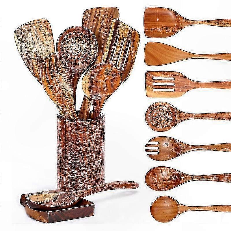 Wooden Cooking Spoons Set with Holder, 9-Piece Teak Utensils for Kitchen Use