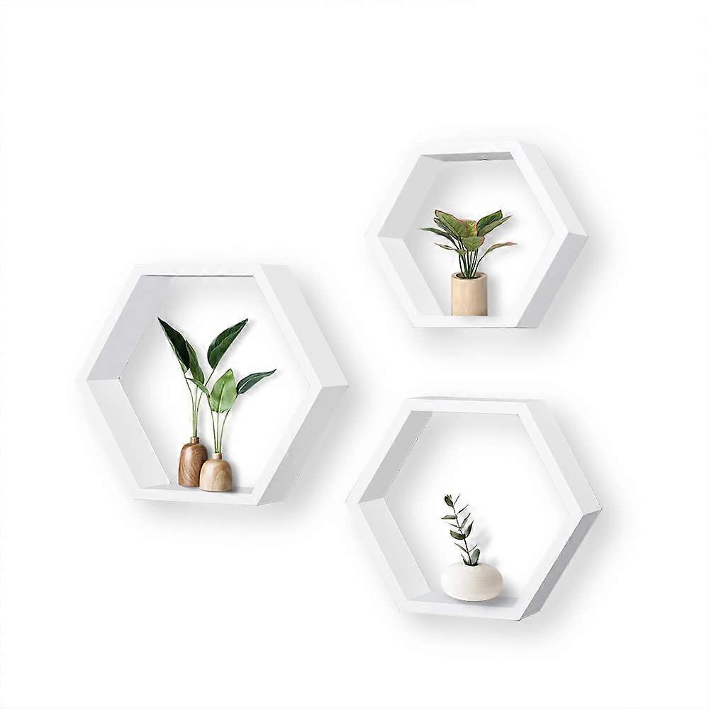 White Wood Hexagon Shelves Set of 3 - Farmhouse Honeycomb Wall Decor for Living Room and Kitchen Storage, Durable & Stylish