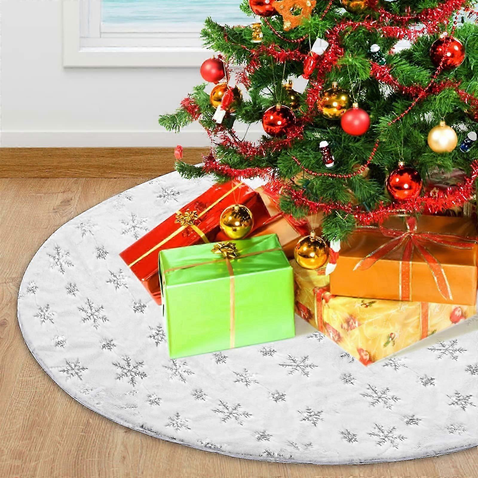 White Christmas Tree Skirt, Large 120cm Christmas Tree Skirt, Faux Fur Christmas Tree Mat, Christmas Tree Base Cover with Embroidered Silver Snowflake