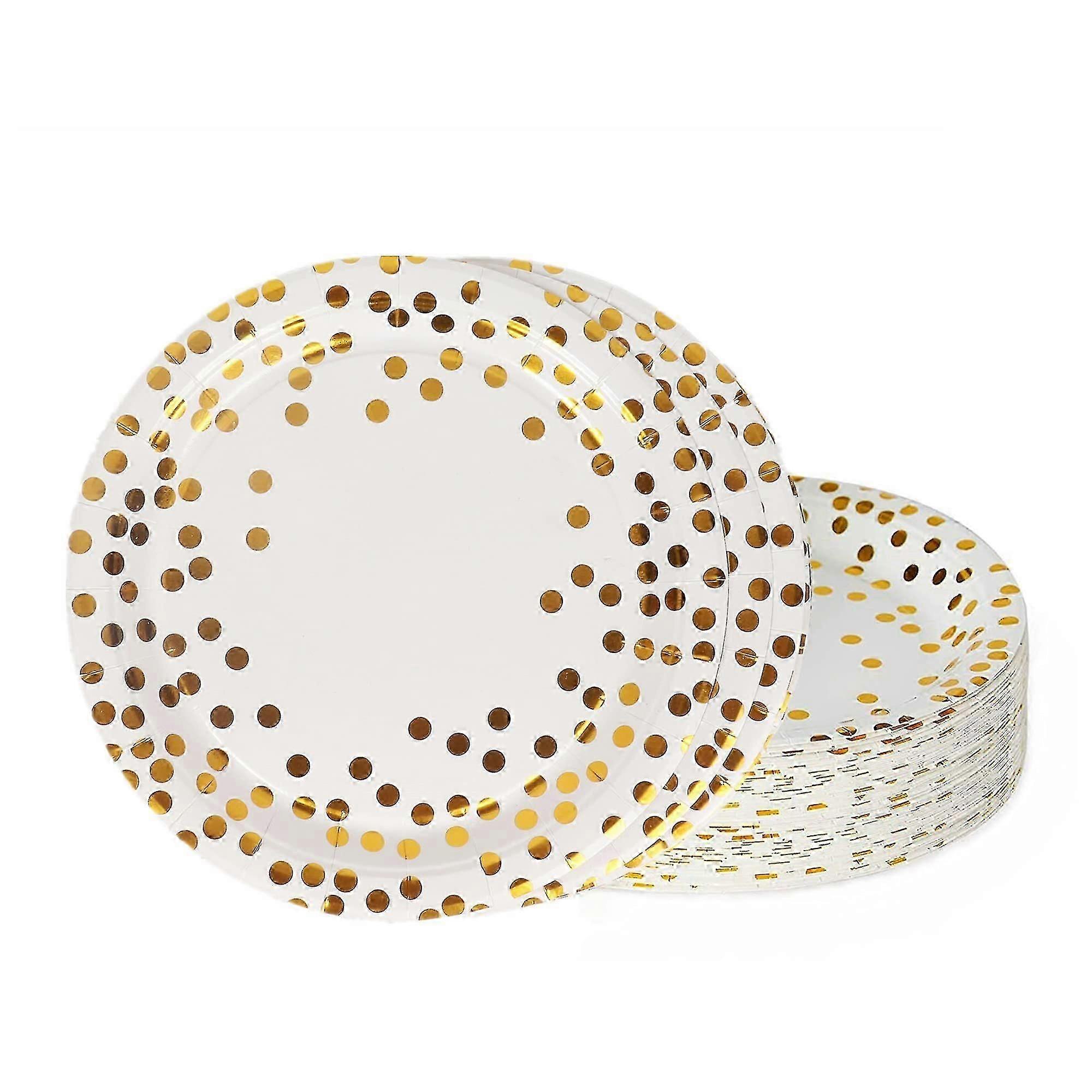 Material: Made from food-grade paper, the plates are sturdy and durable to hold different items, they are not easy to deform. Pretty Design- Paper tabeware supplies are designed in white with gold polka dot, elegant and nice to match well with your decoration and to impress your guests, making your party memorable and impressive Way of uses- The paper plates are very versatile, which you can use to hold many things, such as desserts, salads, cakes, snakes, candies, skewers and more. Wide application- Set can be applied to many occasions, such as parties, birthday parties, anniversaries, weddings, BBQ, etc. Package includes- 50 pieces of 9-inch/22.8cm plates